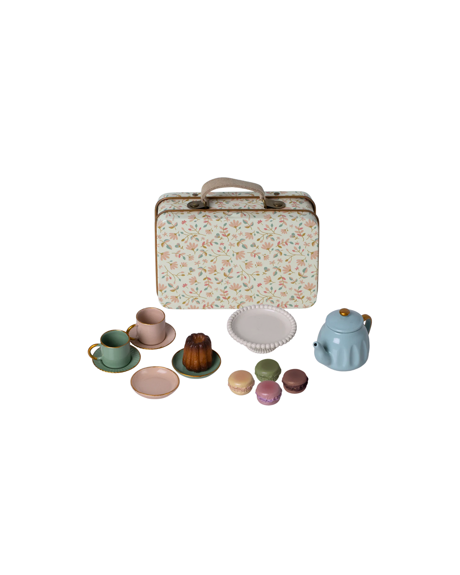 Ce service à thé est adaptée aux souris. Chaque set comprend tout ce dont vous avez besoin pour un moment cosy et un goûter gourmand. Il est présenté dans une valise en métal, joliment décorée.