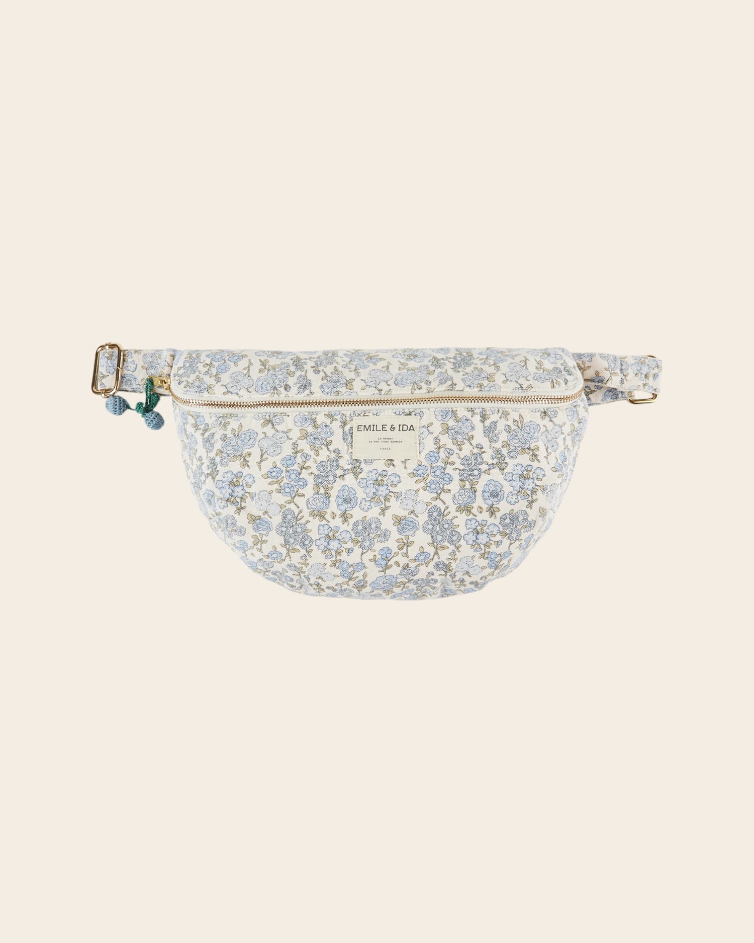Cotton belt bag printed with blue flowers. The vintage look is accentuated by the faded effect, suggesting stories already written.