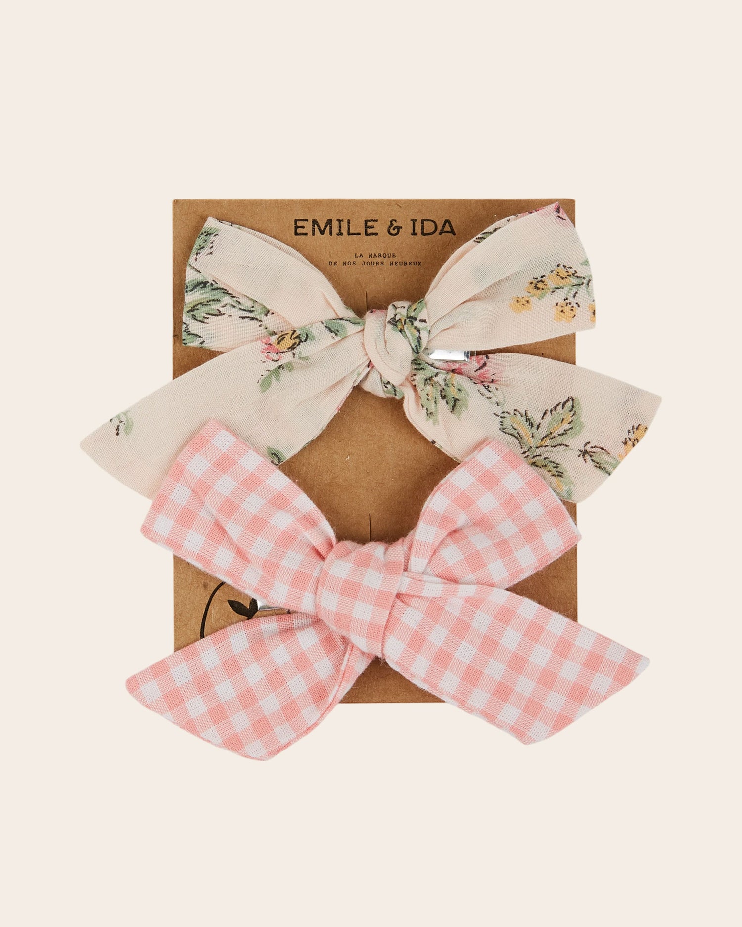 Two cotton bow hair clips. One is made of cream floral fabric, the other of pink and white gingham. Perfect for adding a springtime touch, they can be easily attached to your hair or the lapel of a jacket.