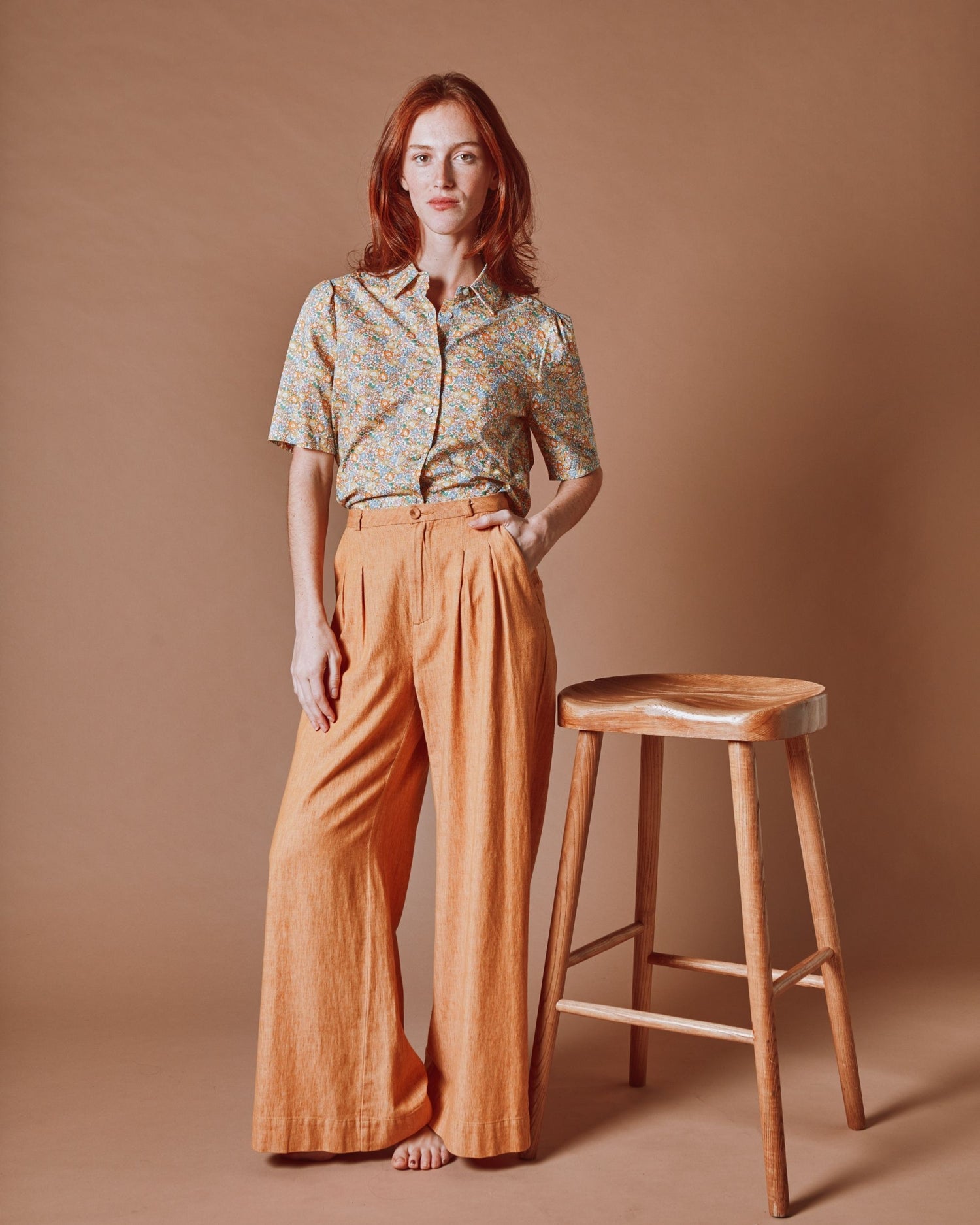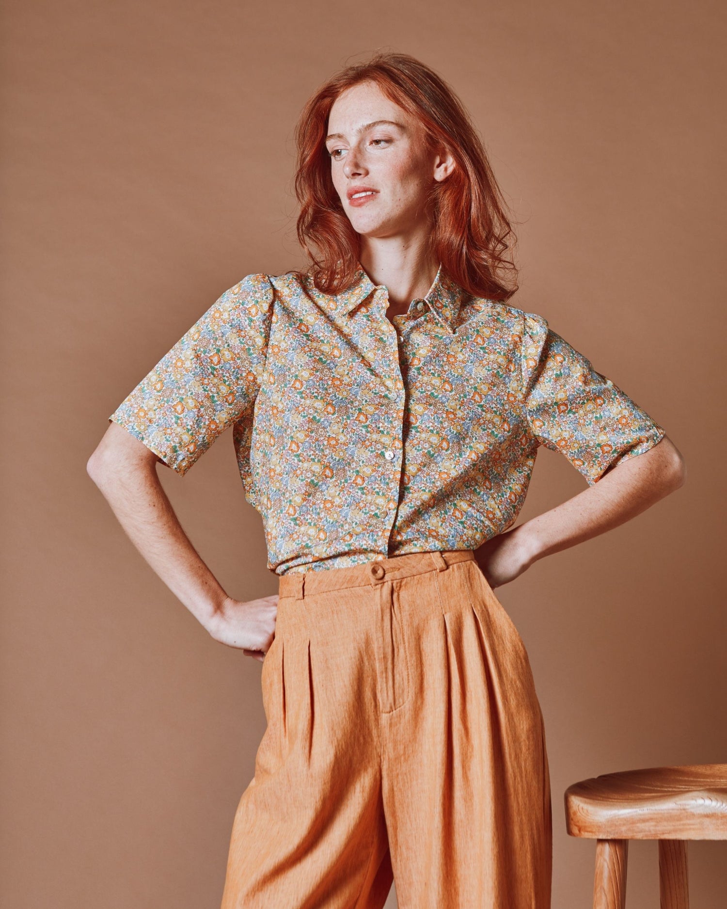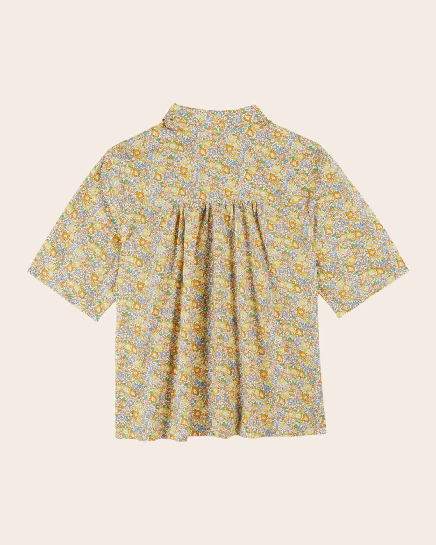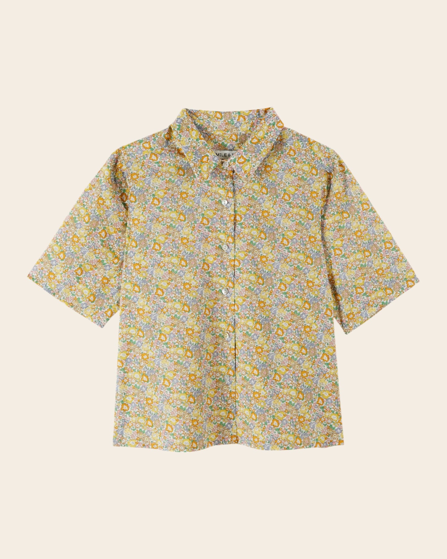 Short-sleeved shirt in genuine Liberty of London fabric, featuring a vibrant multicolored floral print.