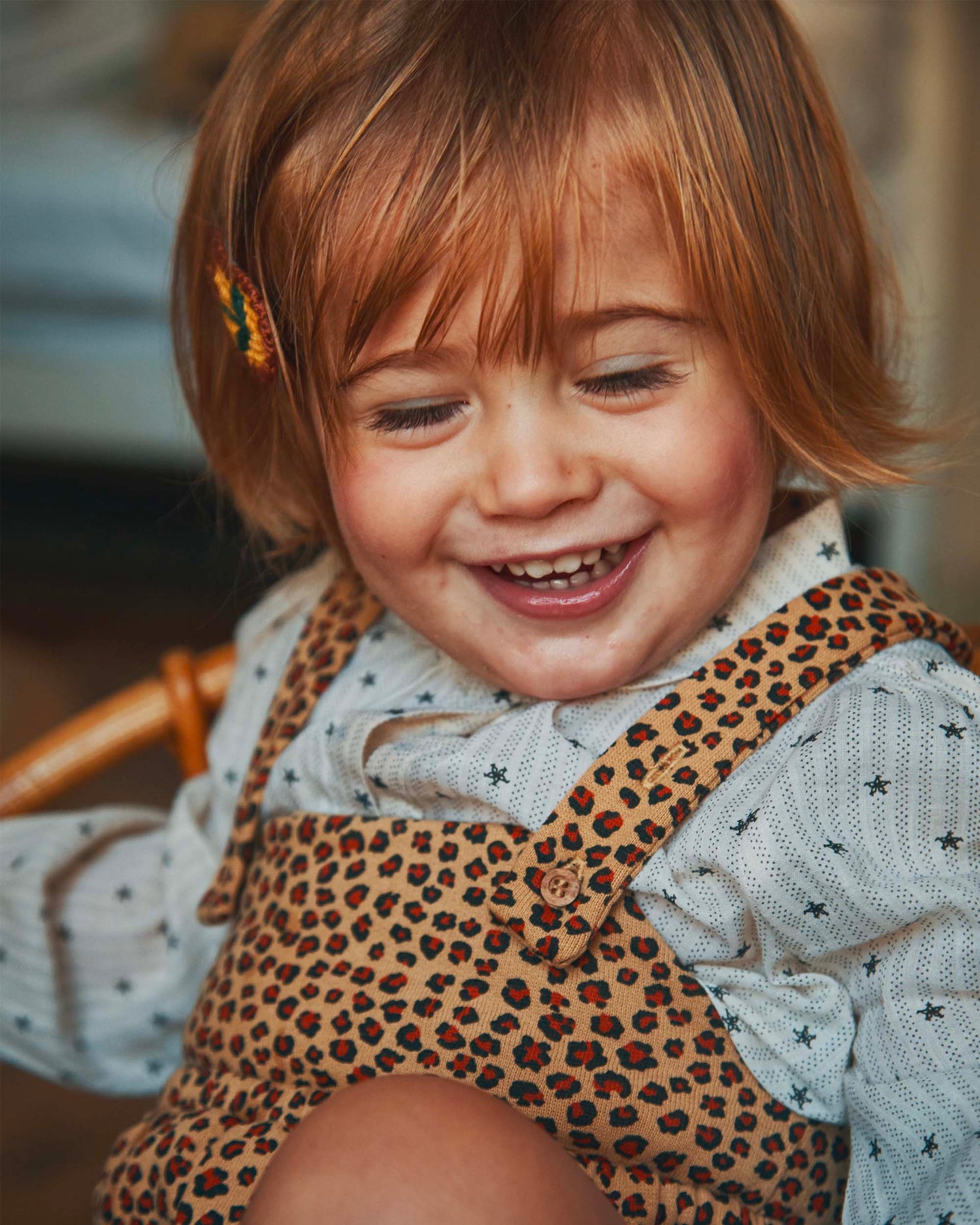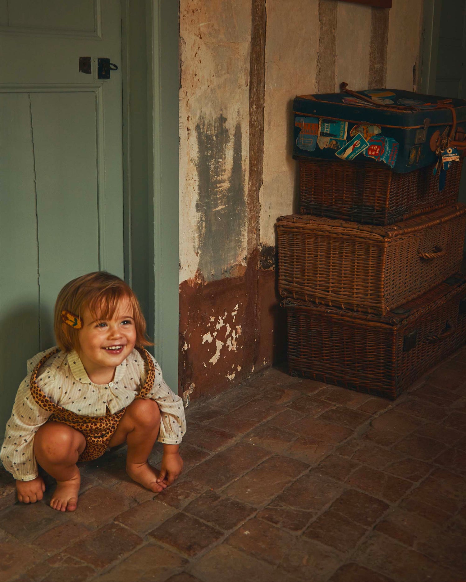 Blouse in ecru cotton whose background is animated by black stars in all-over and vertical lines formed by tiny gray dots. A blouse for all those who dream of exploring the universe whose flared shape, reinforced by gathers around the neckline, leaves a great amplitude to the movements of little girls. Long sleeves tightened at the wrists, slit on the front that closes, like the cuffs, with a natural mother-of-pearl button and small Claudine collar.