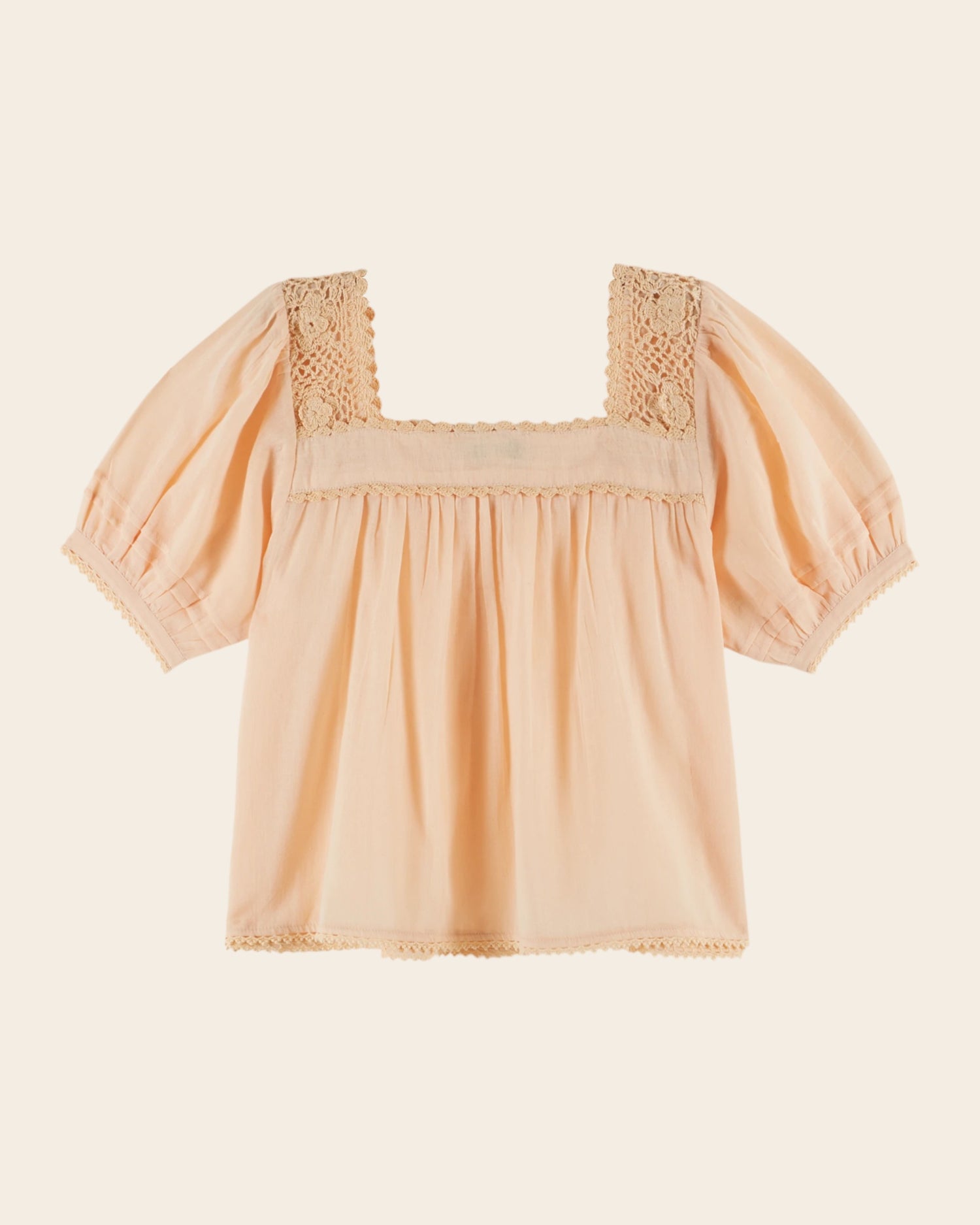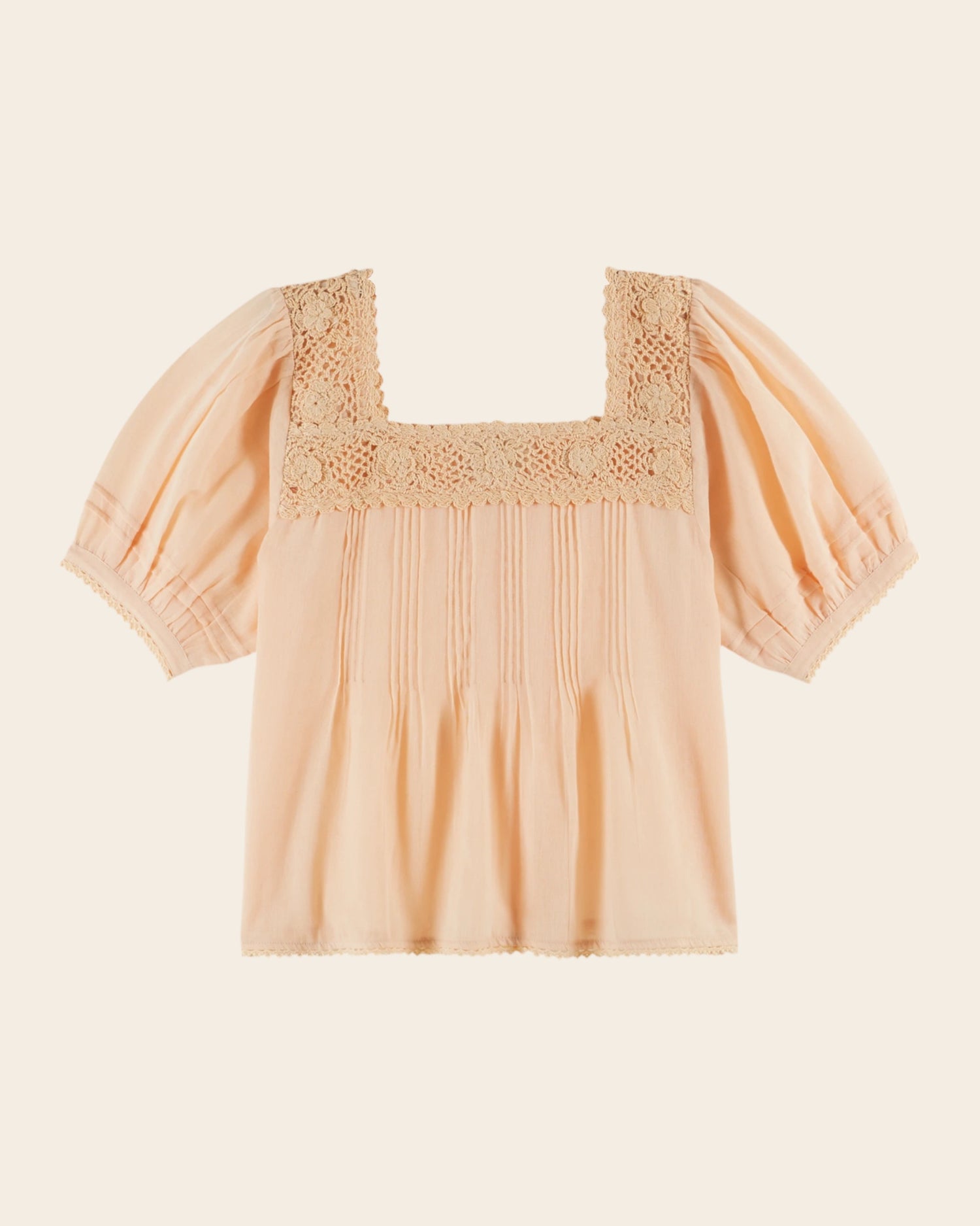 Apricot organic cotton blouse. Its originality lies in the hand-crocheted lace inserts, the ladder stitching that outlines the embroidery inserts, and the bands of small flat pleats.