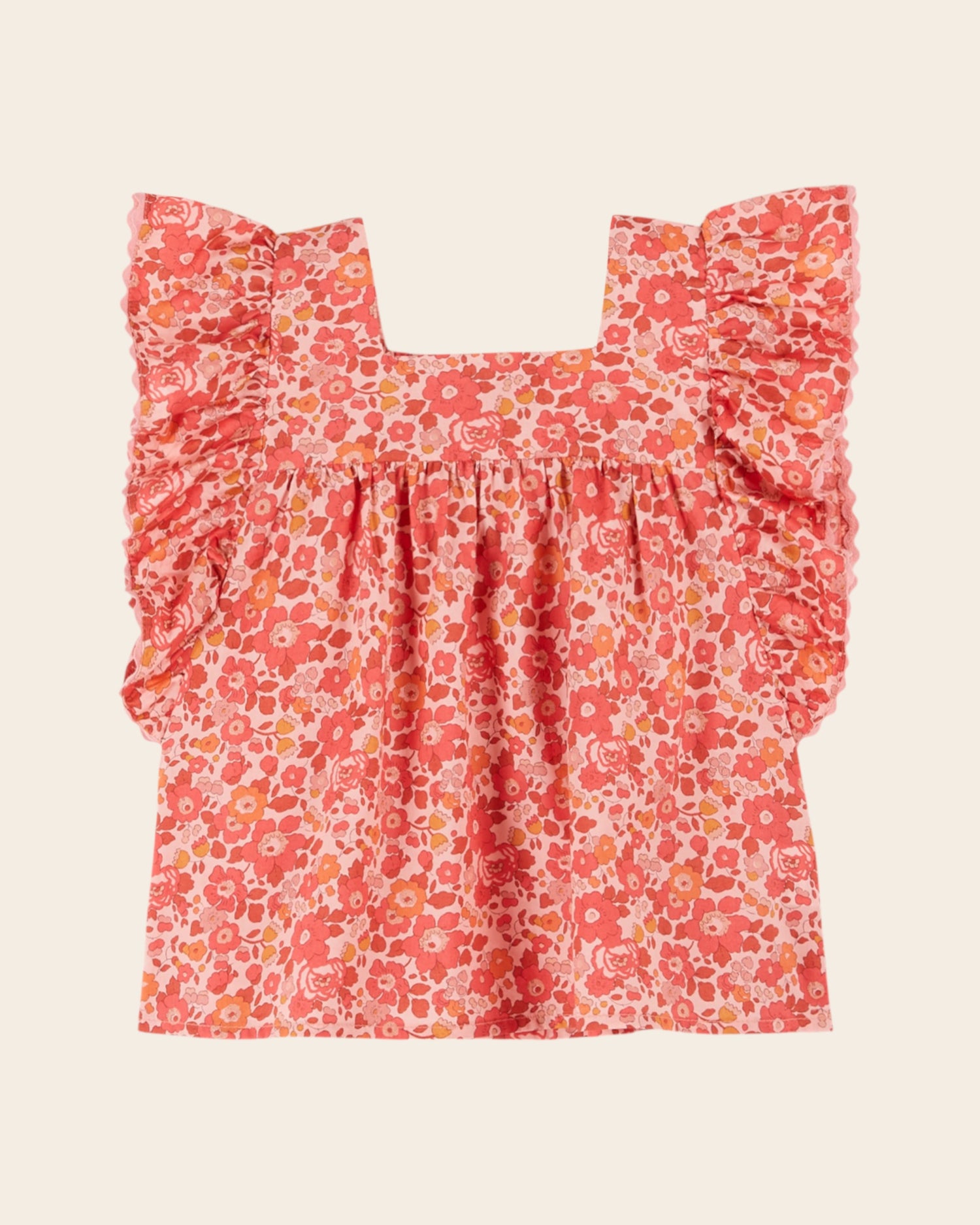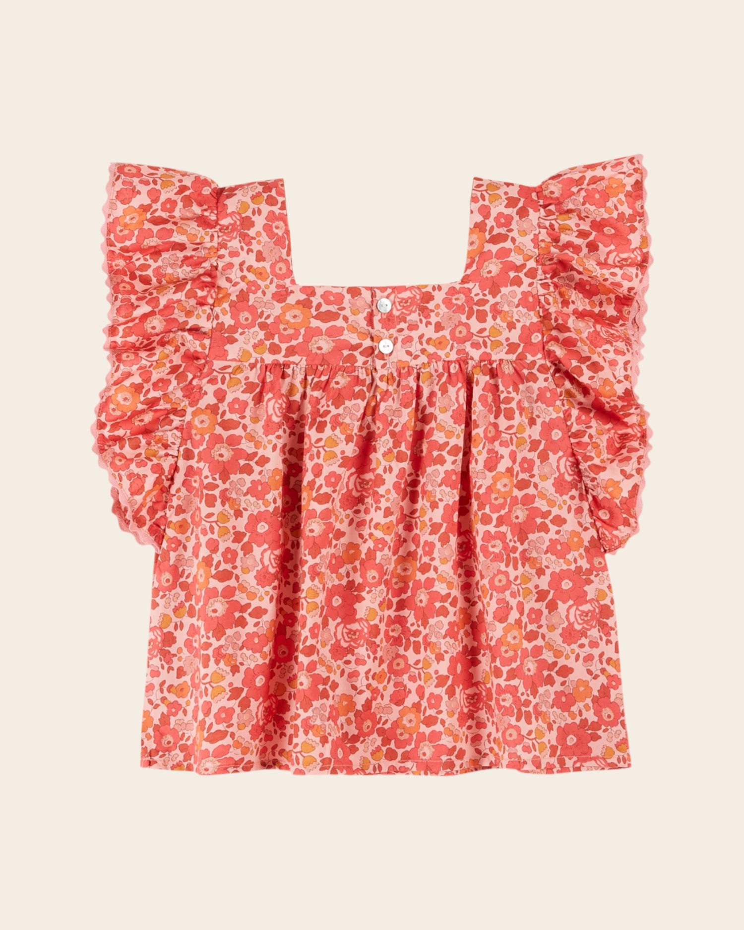 Blouse in genuine Liberty of London, printed with a multitude of red flowers on a pink background, reminiscent of an English garden in full bloom.