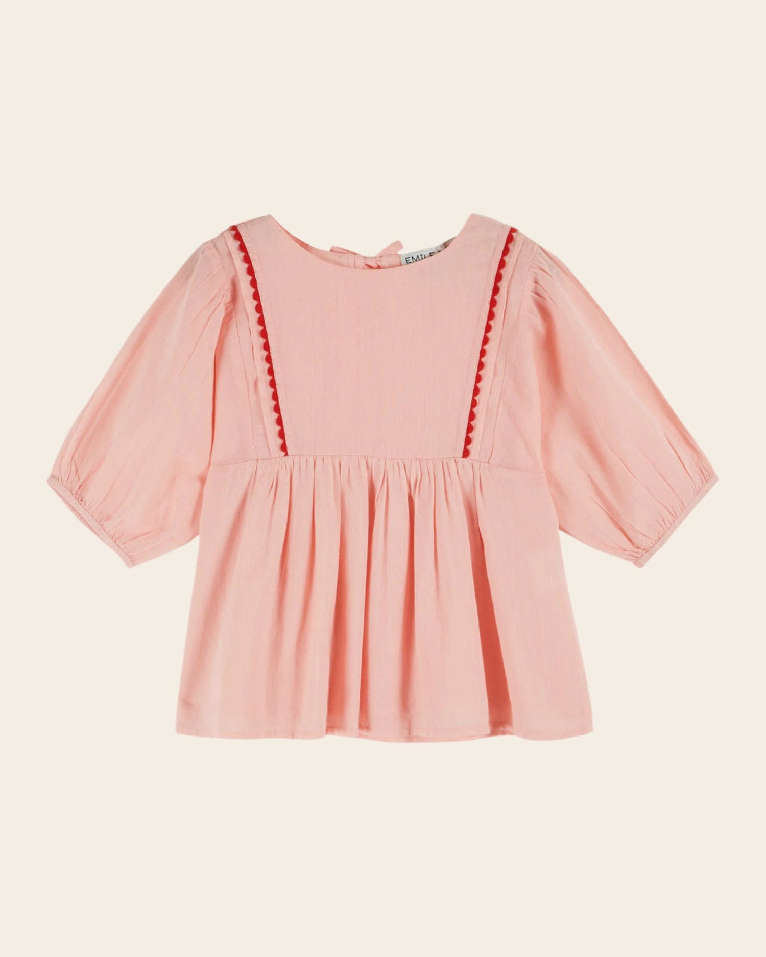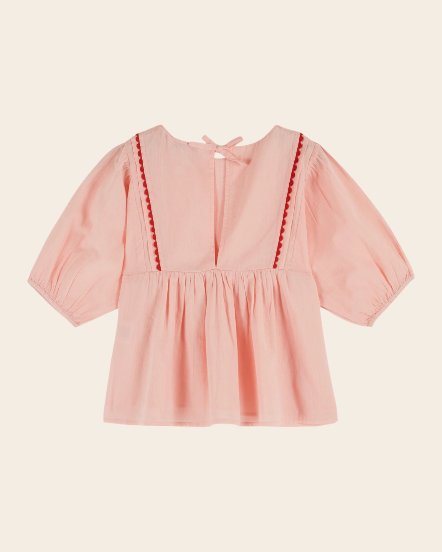 Plain pink organic cotton voile blouse. The large yoke on the front and back ends on the sides with folded pleats and red croquet braid.