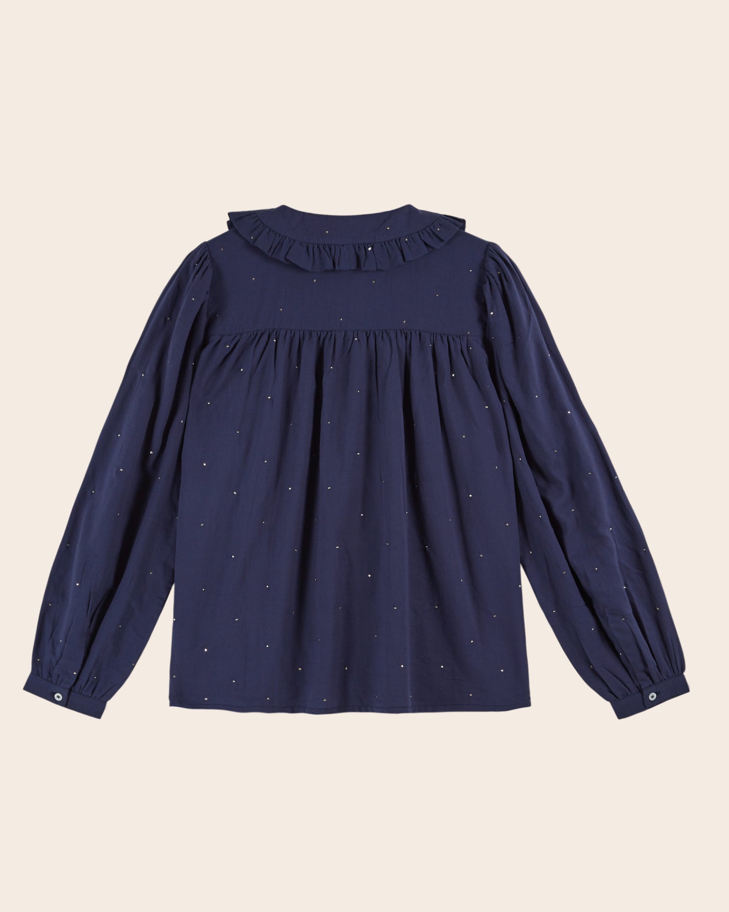 Navy cotton voile blouse embellished with silver sparkles all over. This technique, which involves small metal sparkles attached to the fabric by Indian artisans, is called mukesh.