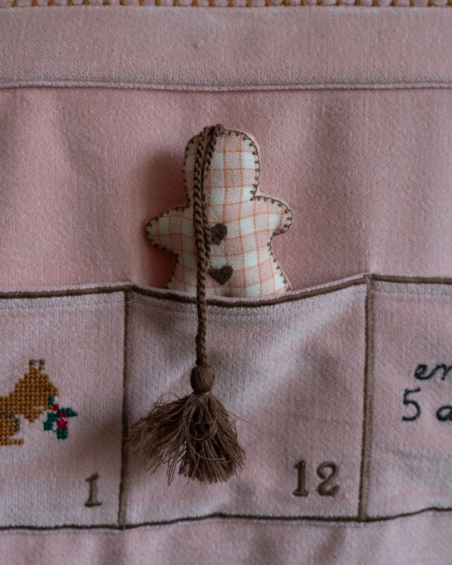 Embroidered advent calendar in pink cotton velvet.
