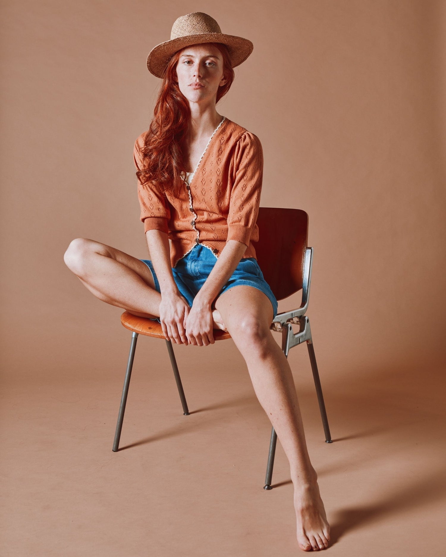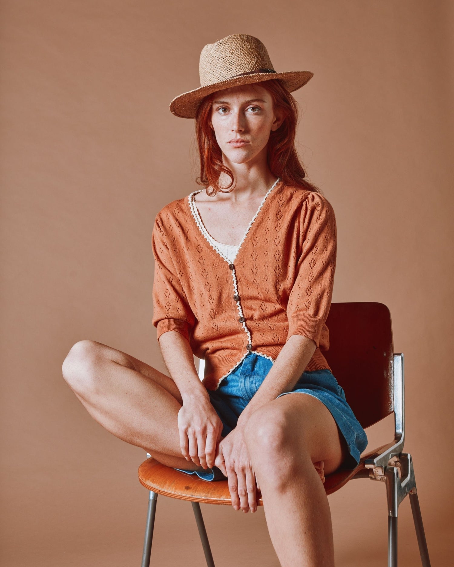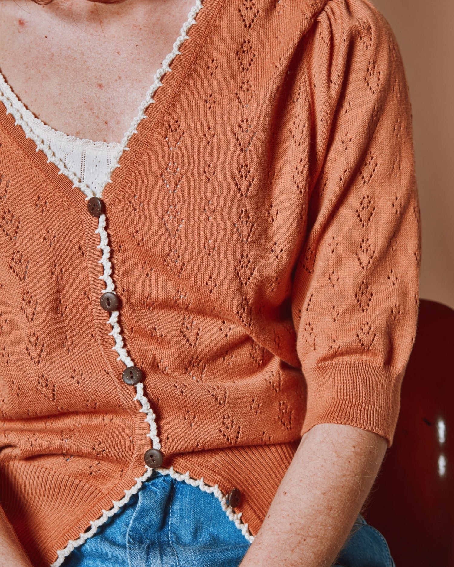 This short-sleeved cardigan in cinnamon brown organic cotton combines softness, refinement, and originality thanks to its fancy knit pattern.