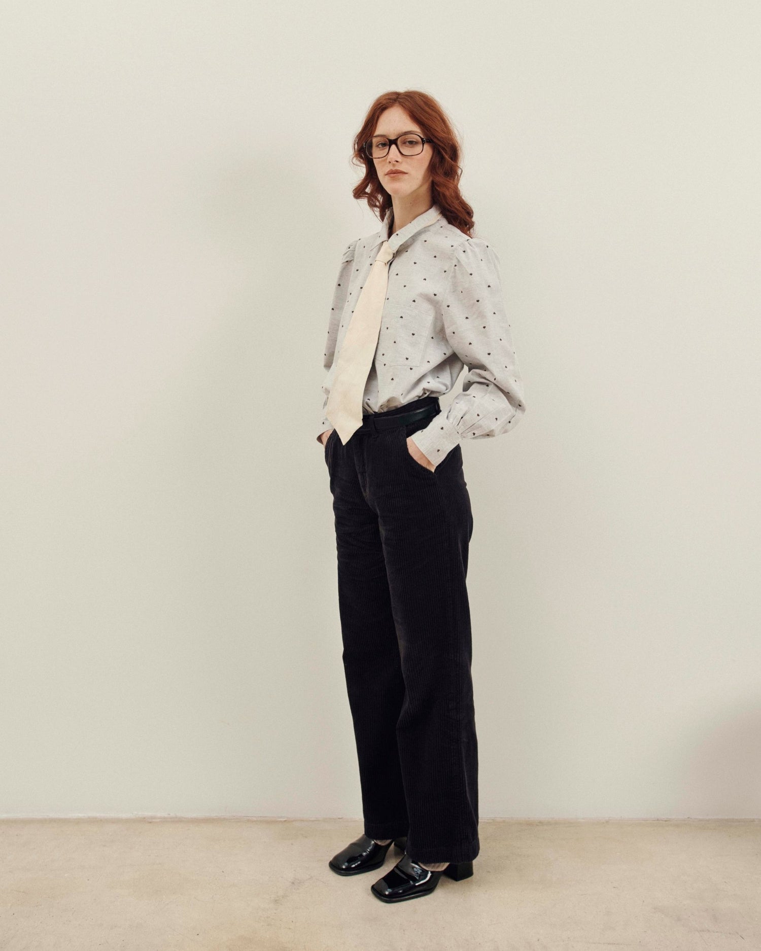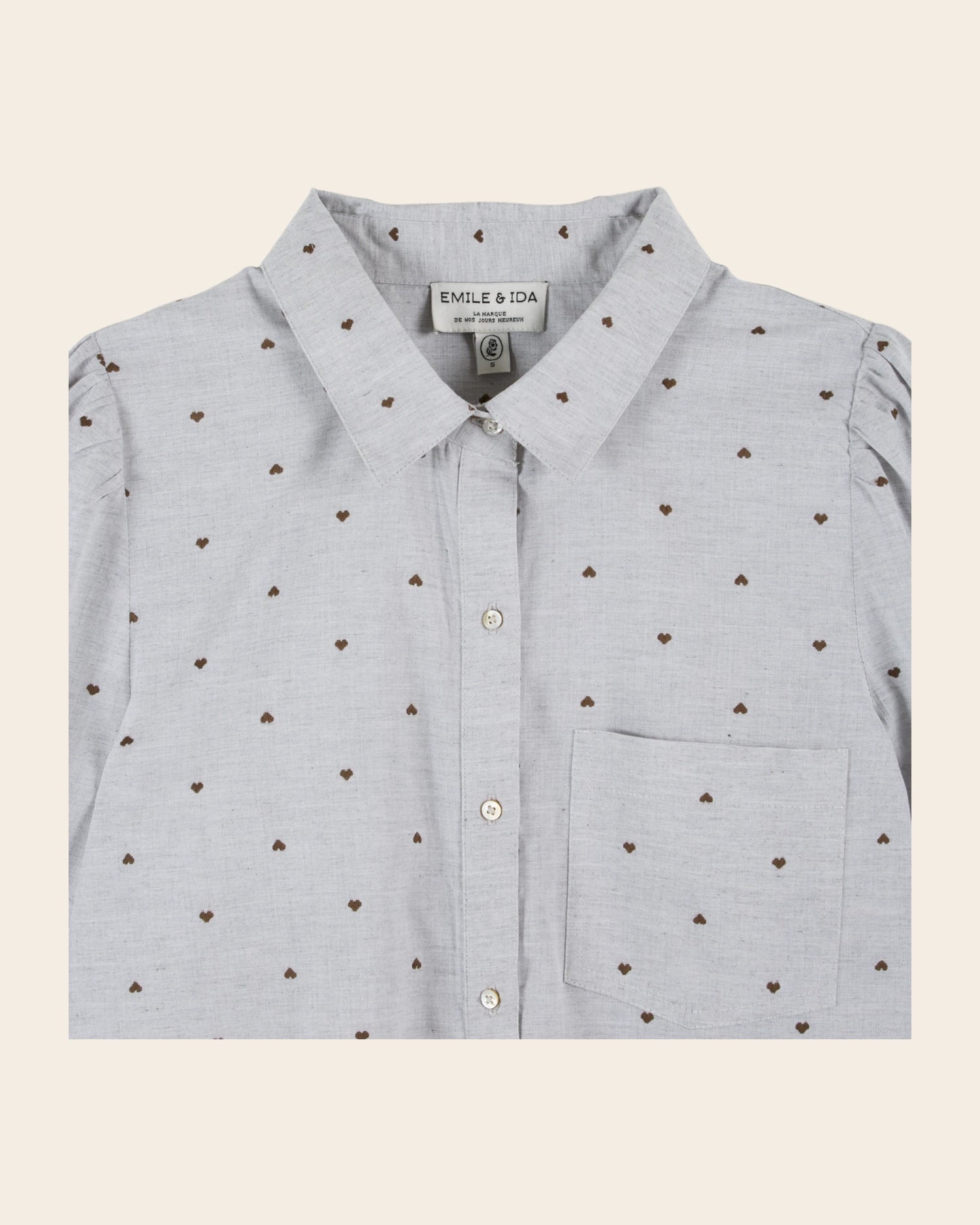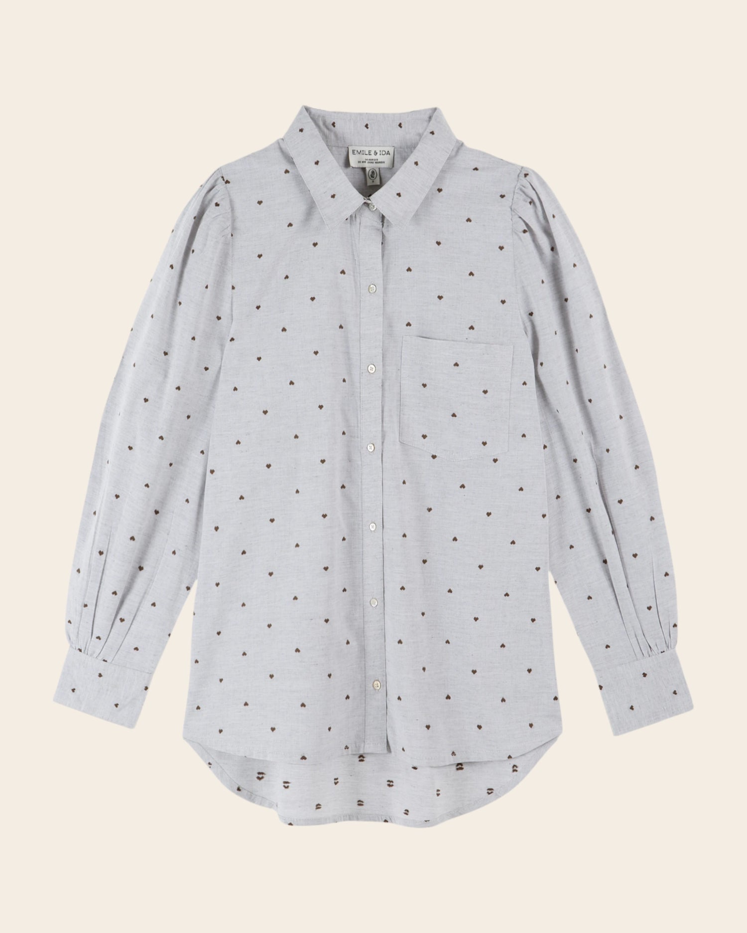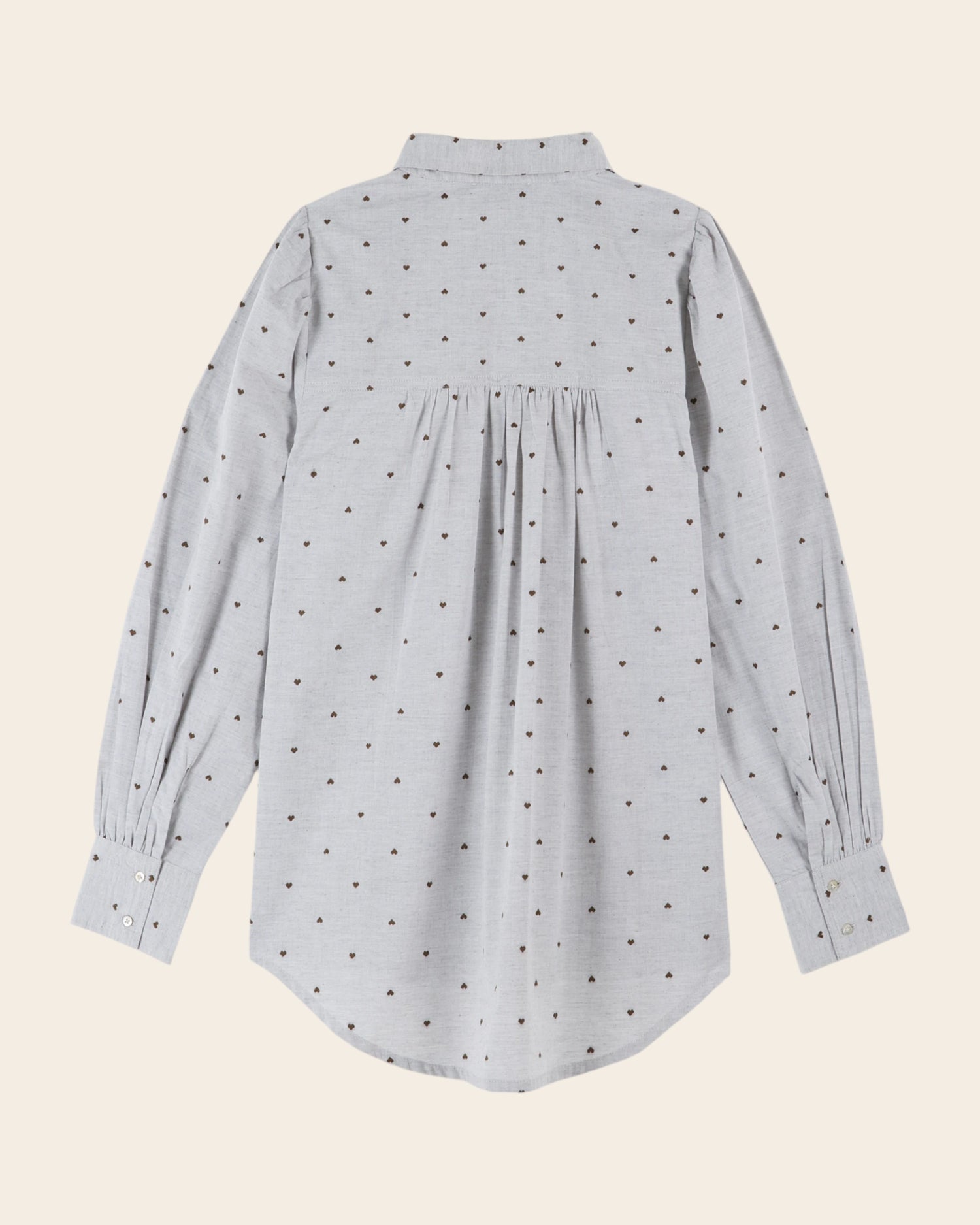 Shirt in mottled gray cotton dotted with little khaki hearts embroidered in jacquard. The over-size cut is inspired by men's shirts.