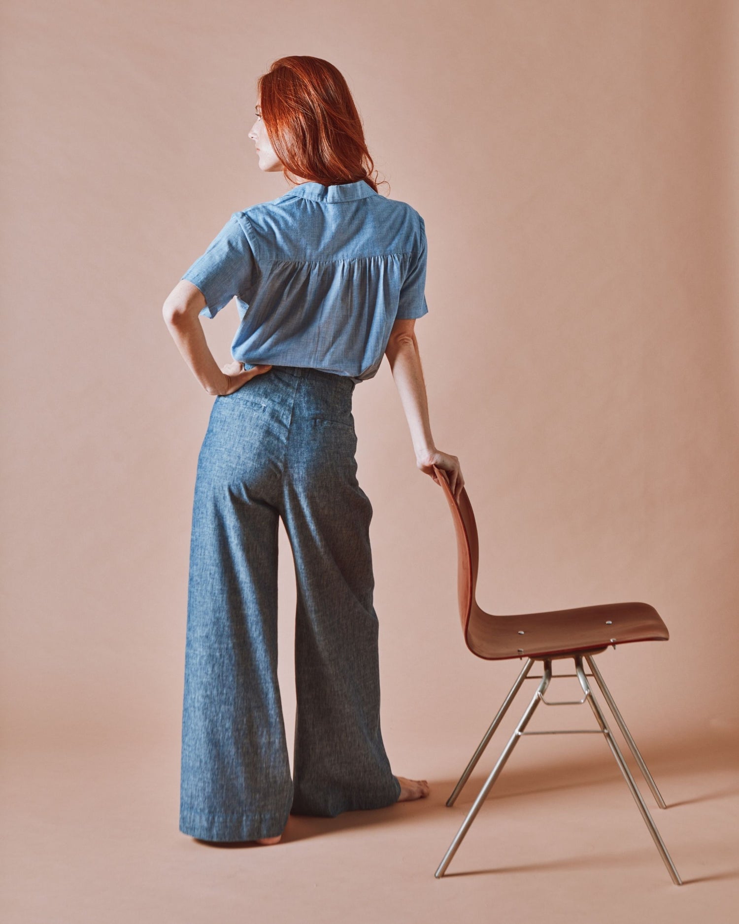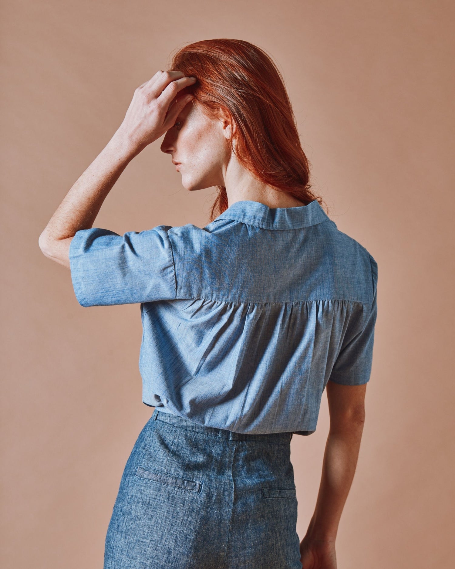 Short-sleeved blue chambray shirt.