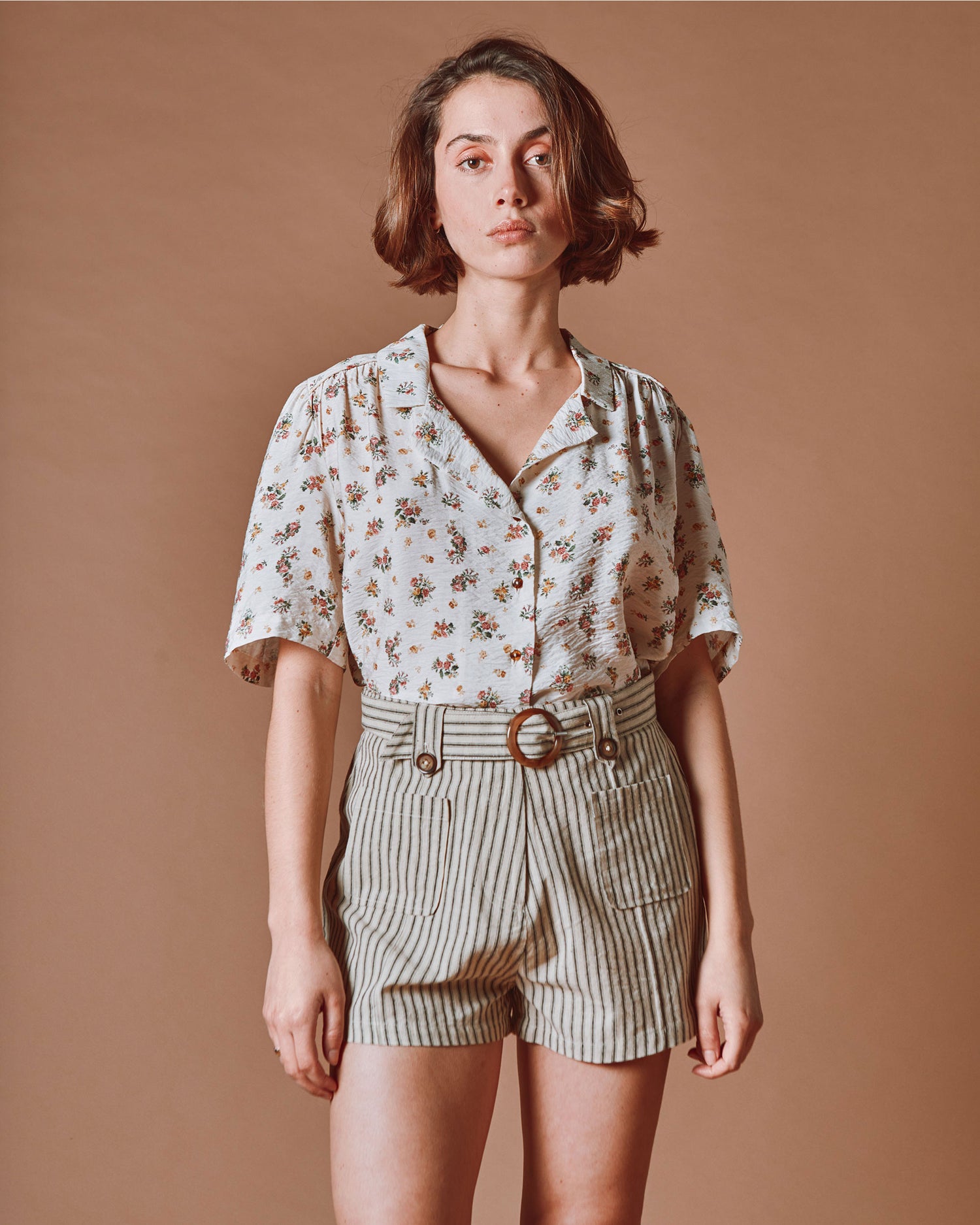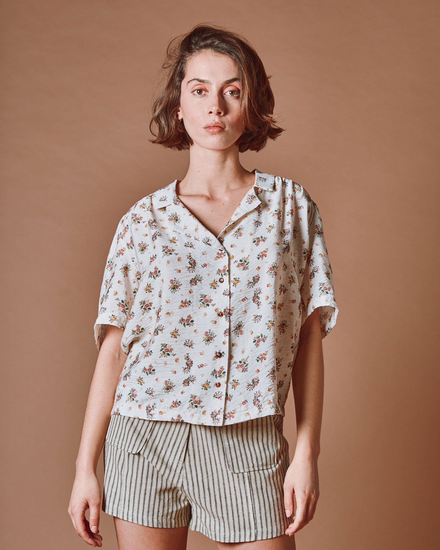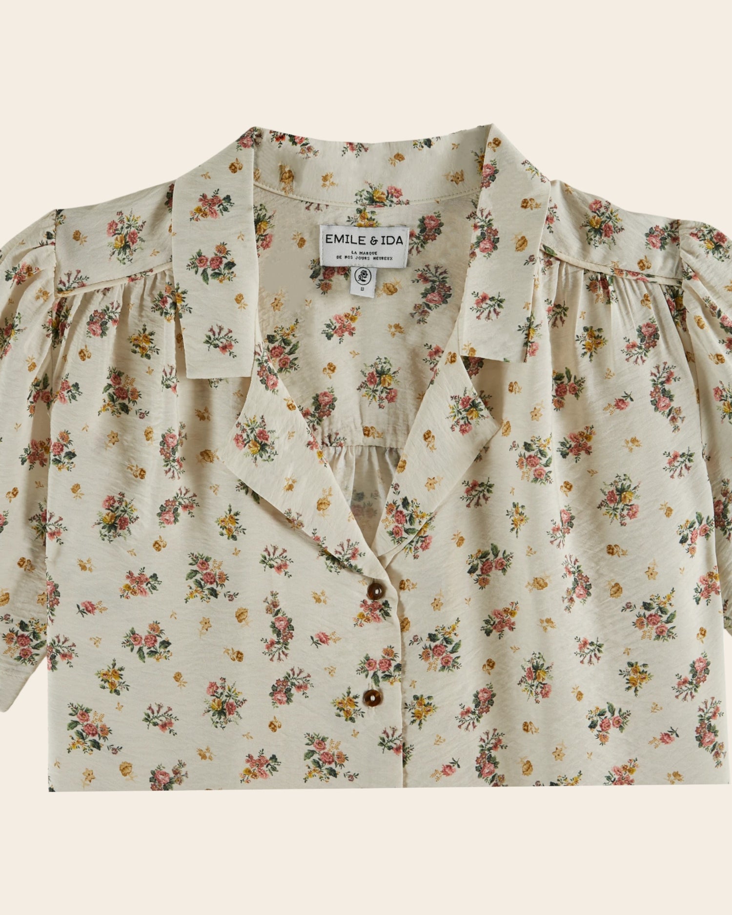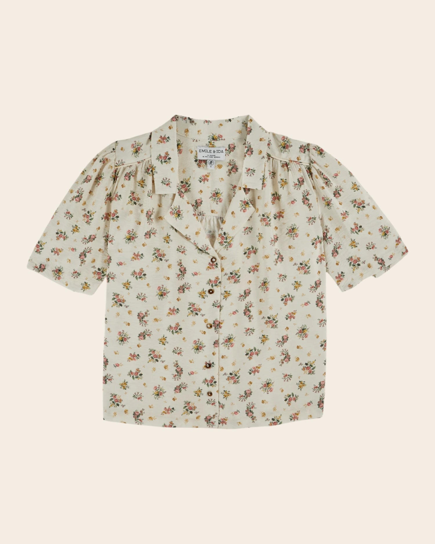Ecru floral print viscose shirt.