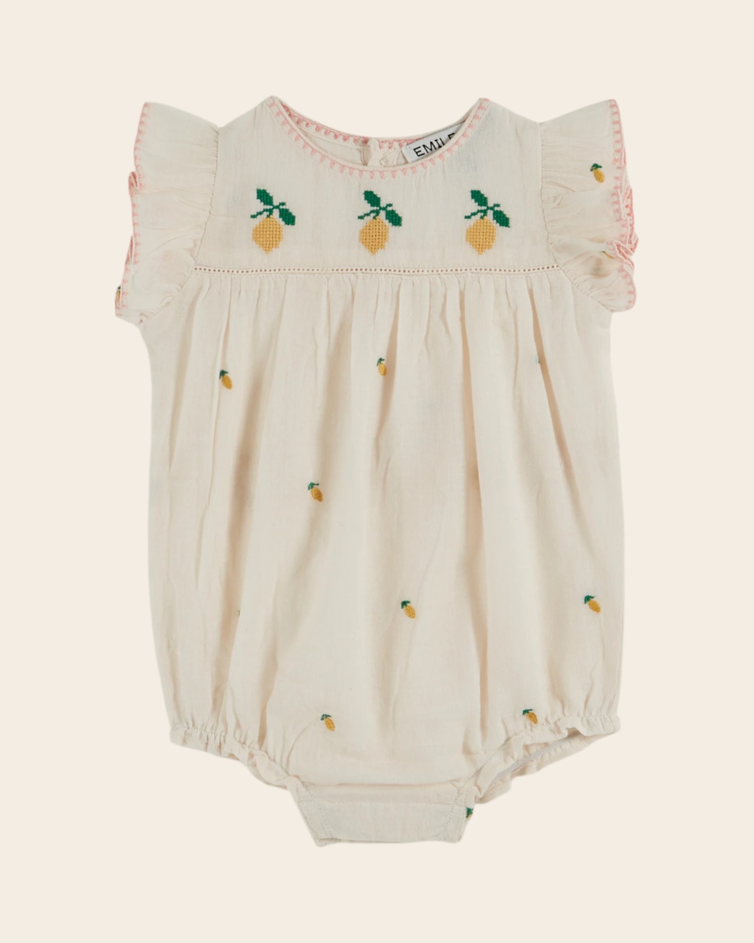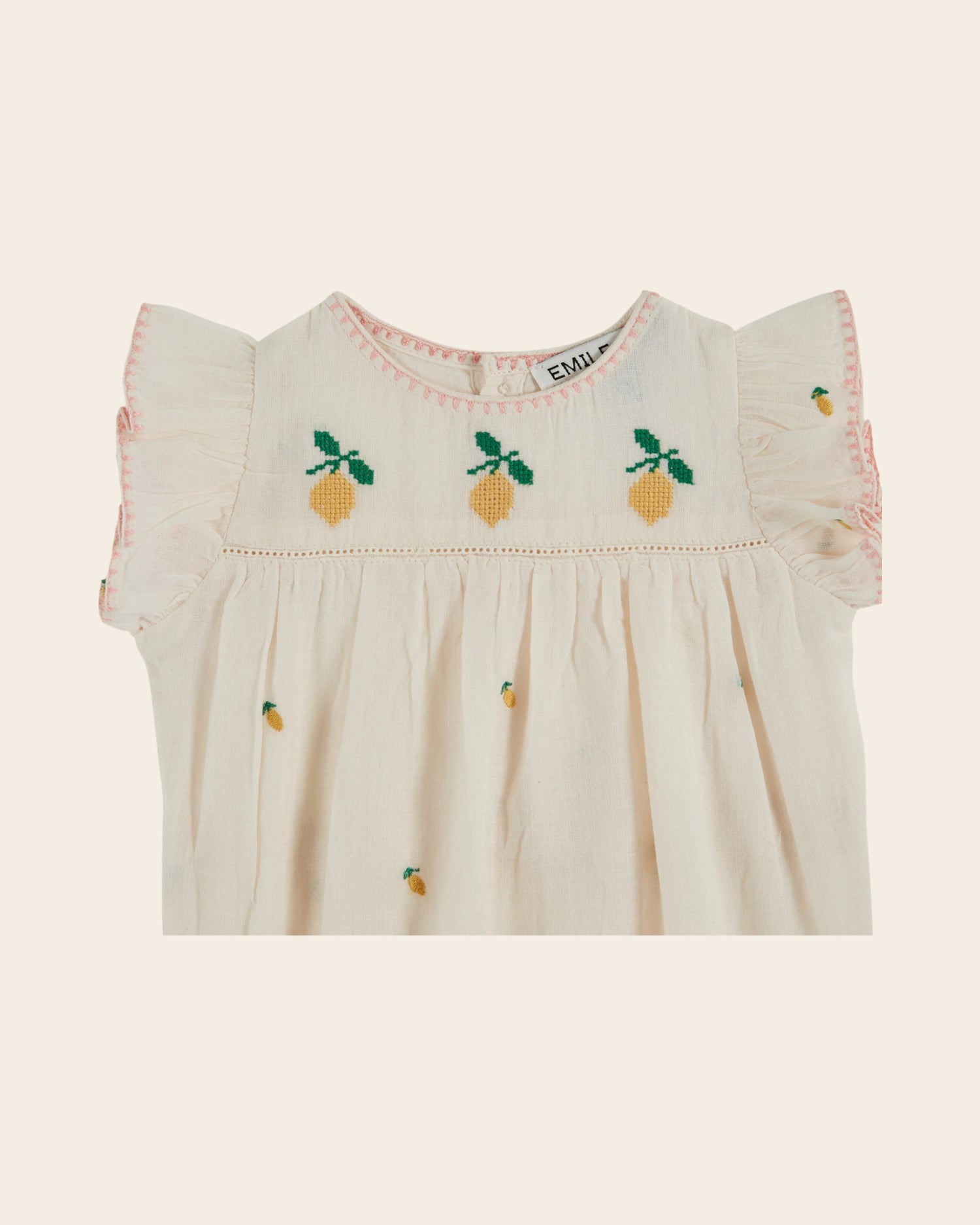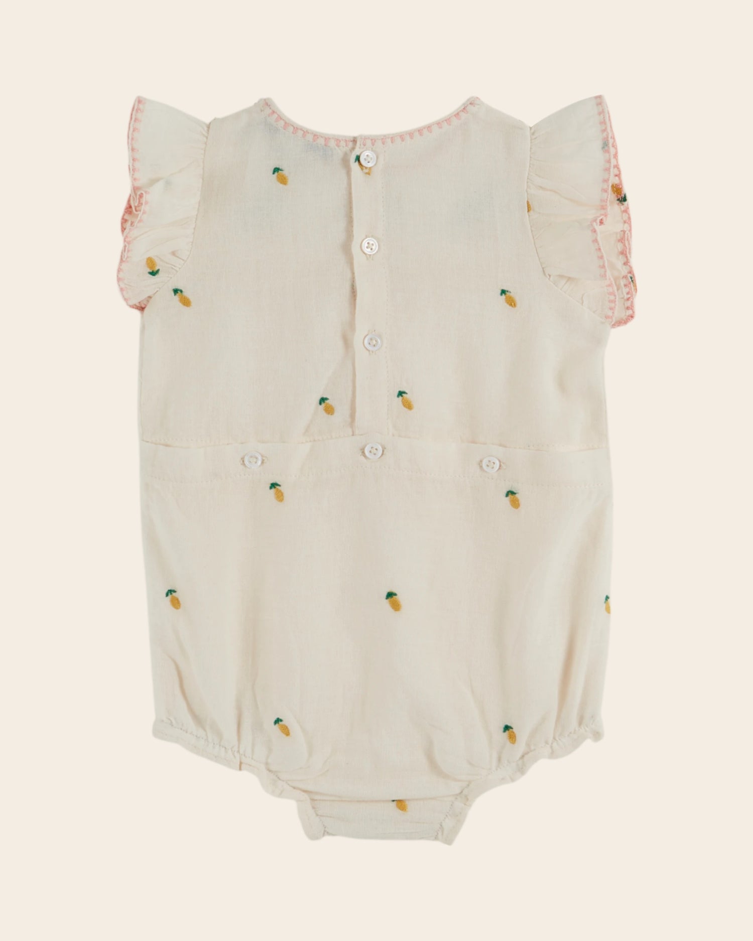 Combibloomer in soft cream organic cotton gauze embroidered all-over with yellow lemons. It is embellished with pink embroidery in grebiche stitch around the neckline and ruffles, on the yoke with three lemons embroidered in cross stitch by Indian artisans.