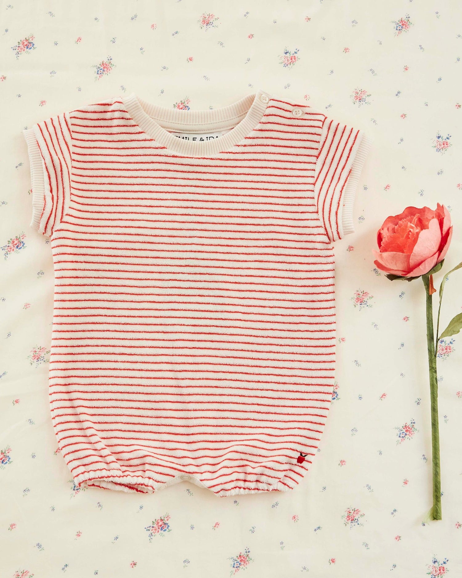 Playsuit in organic cotton velvet and white mixed fibers with fine poppy red stripes.