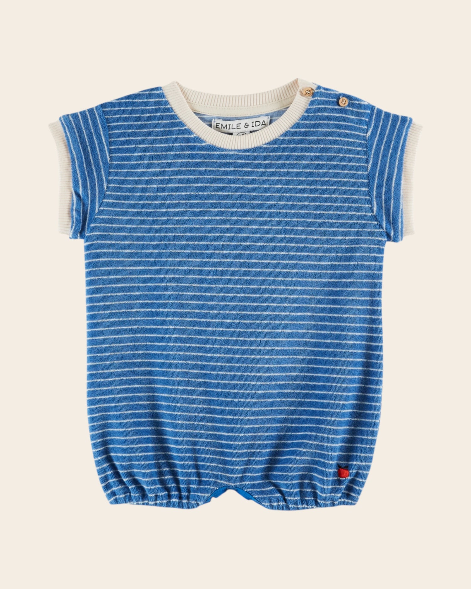 Playsuit in organic cotton velvet and blue mixed fibers with fine white stripes.