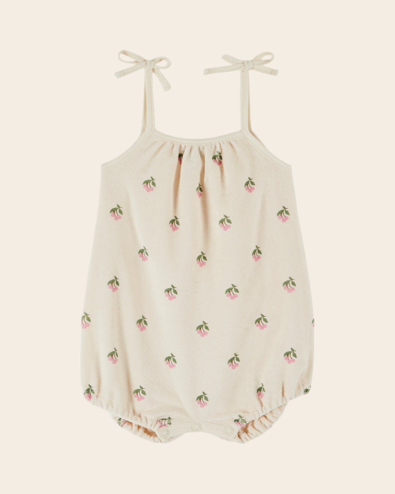 Playsuit with spaghetti straps in cotton velvet and cream mixed fibers printed all-over with mini bouquets of pink cherries.