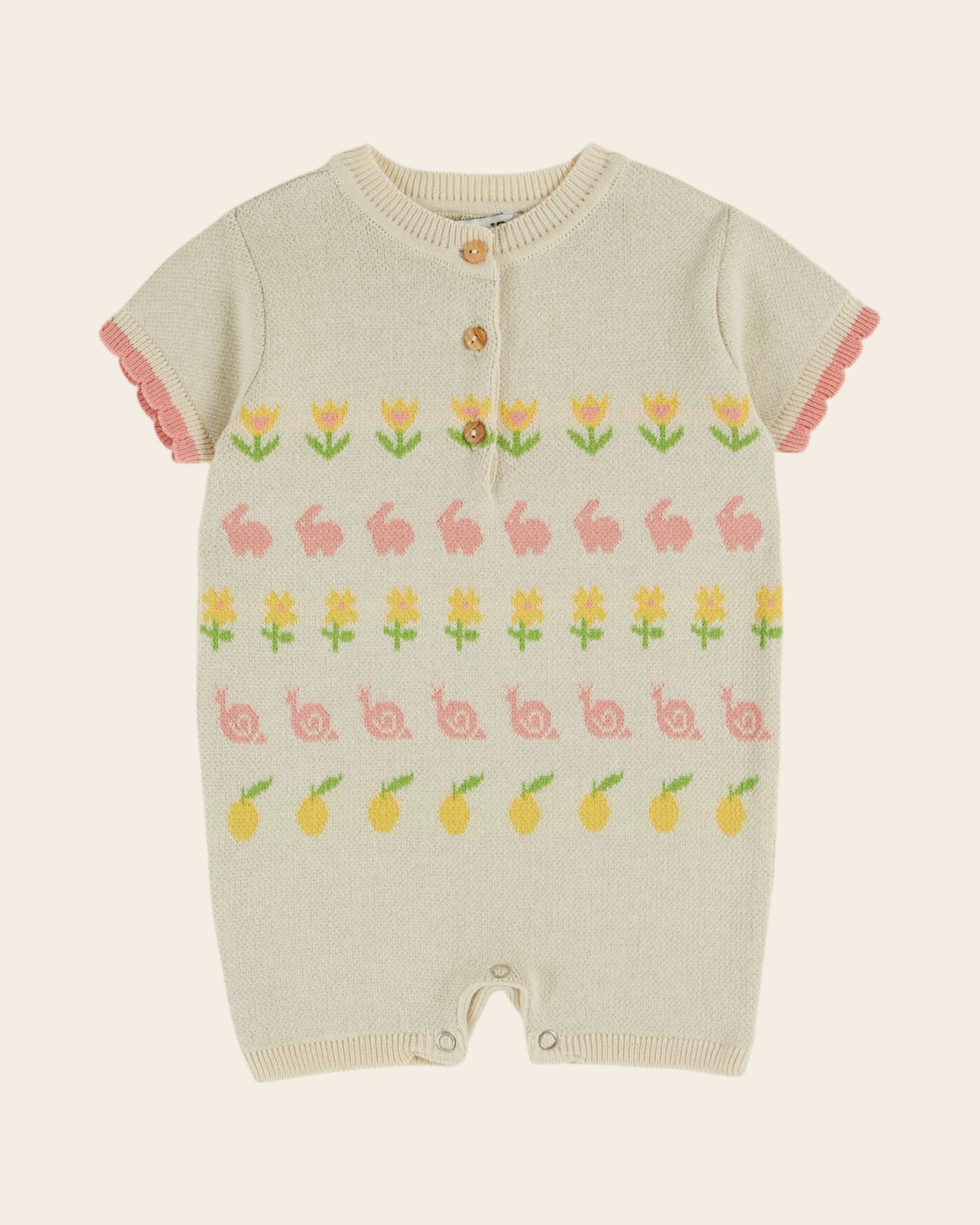 Beige organic cotton playsuit. The lines of pink rabbits and snails interspersed between the lines of flowers and yellow lemons, knitted in intarsia, give thickness to the combibloomer.