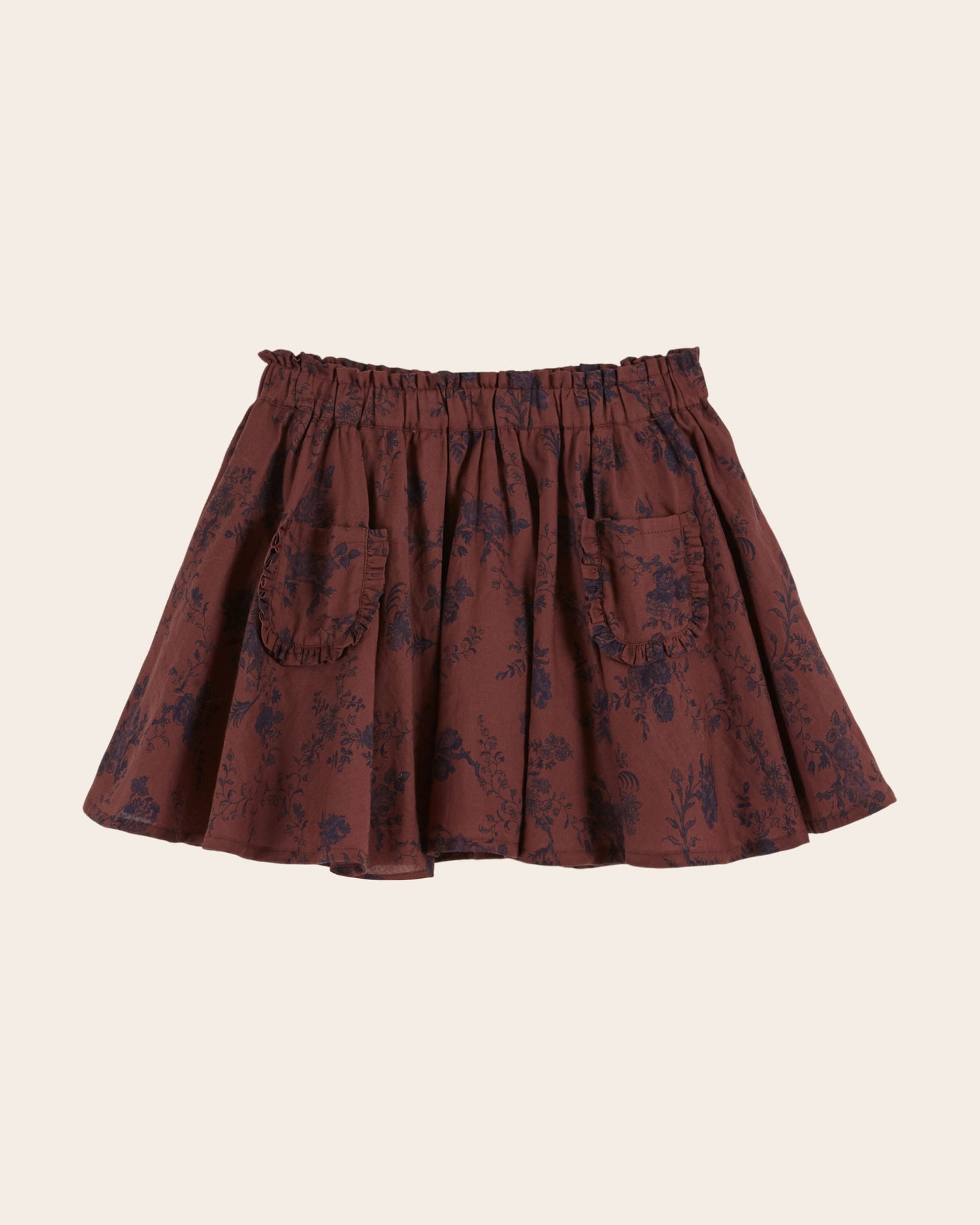 Purple cotton mini skirt decorated with blue flowers on a purple background.