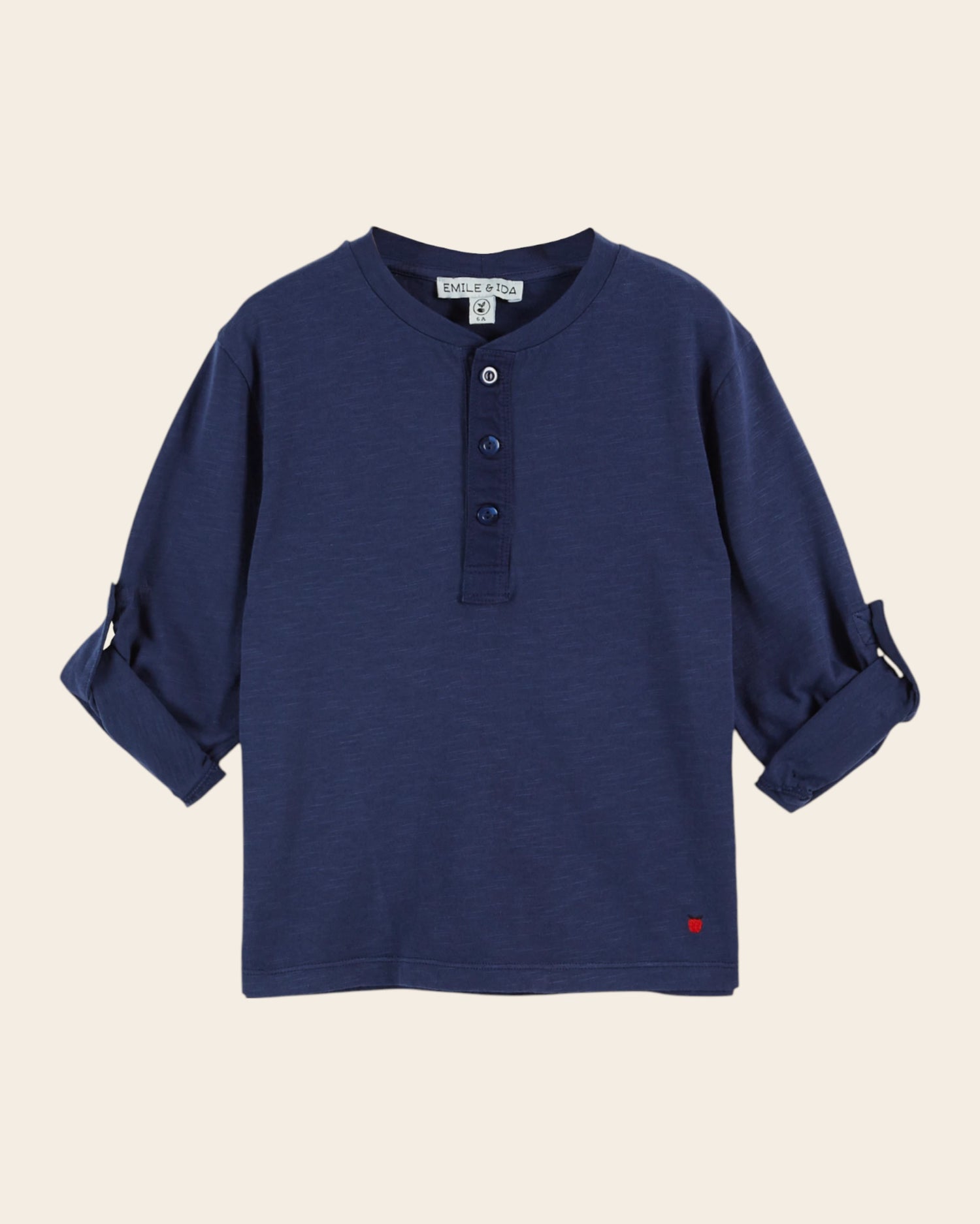 - Long roll-up sleeves with button placket