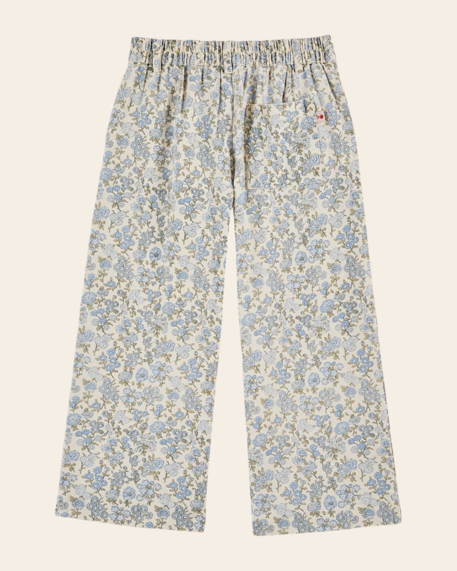 White cotton canvas pants printed all-over with blue flowers. Trousers to become one with spring, colors to encourage softness!