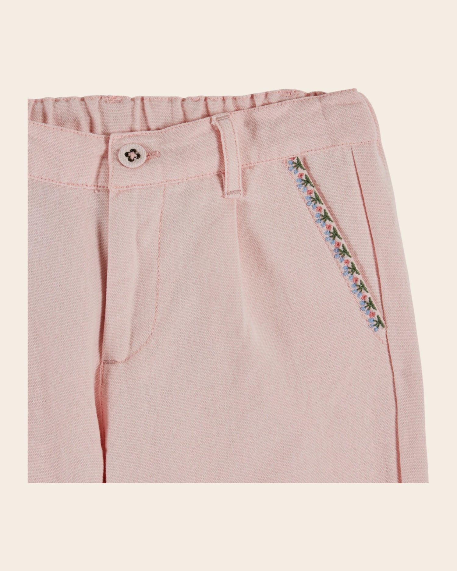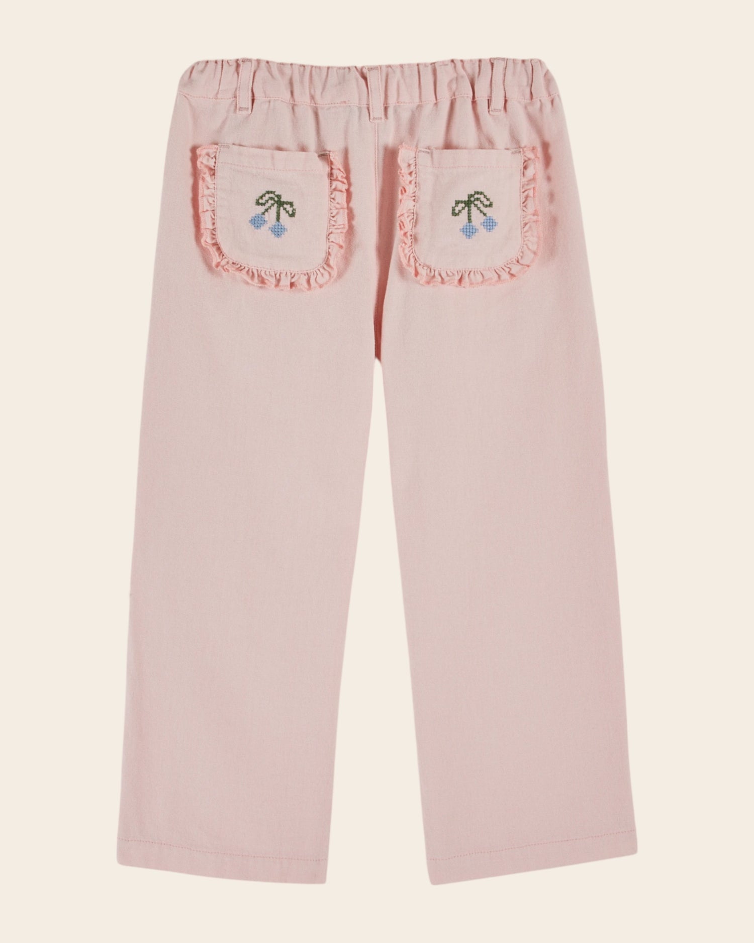 Pink cotton canvas pants. Mini embroidered cherries enliven the edge of the Italian pockets and cross-stitch cherries brighten up the patch and ruffled pockets on the back.