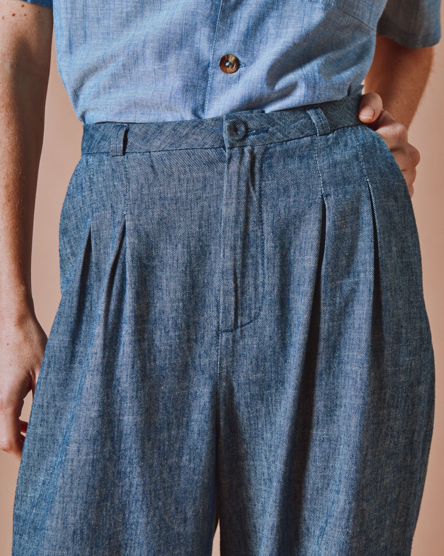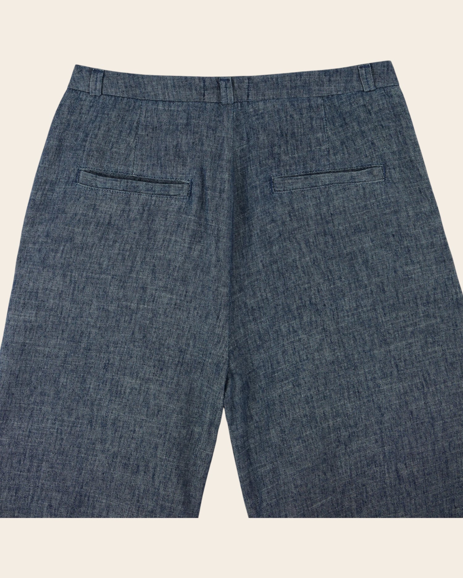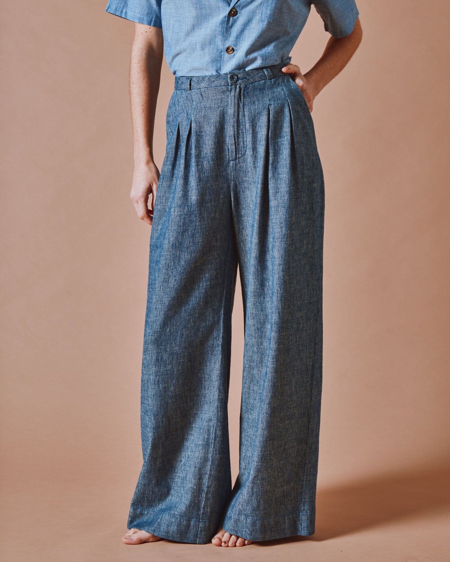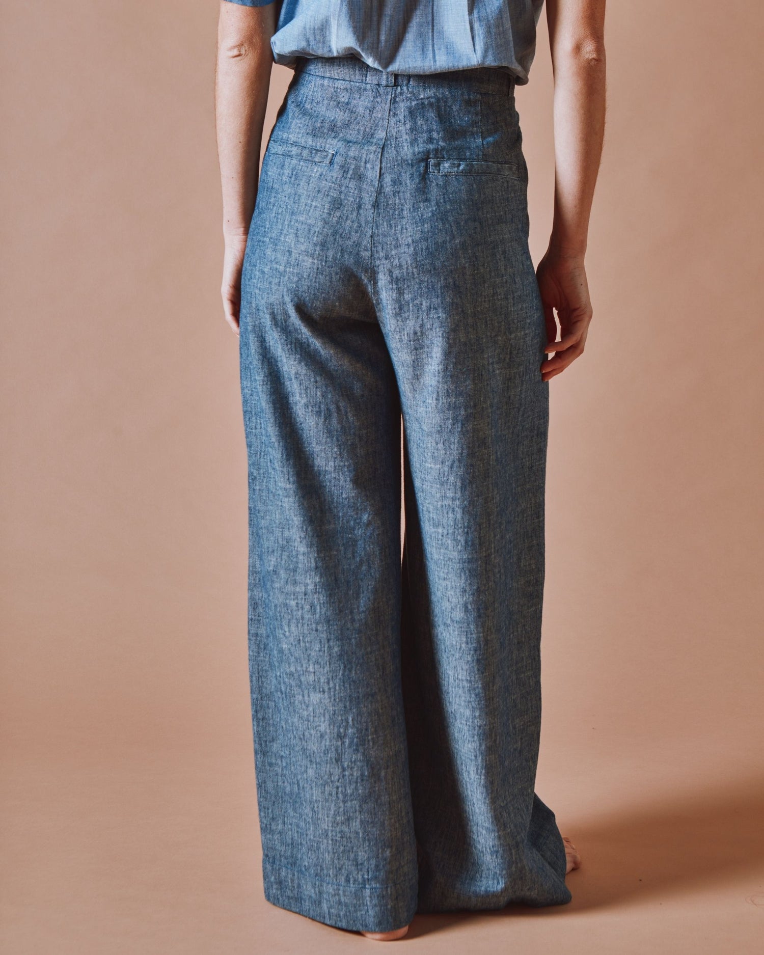 Loose-fitting navy blue cotton and linen pants. With a high waist and wide legs, this XXL style flatters all figures.