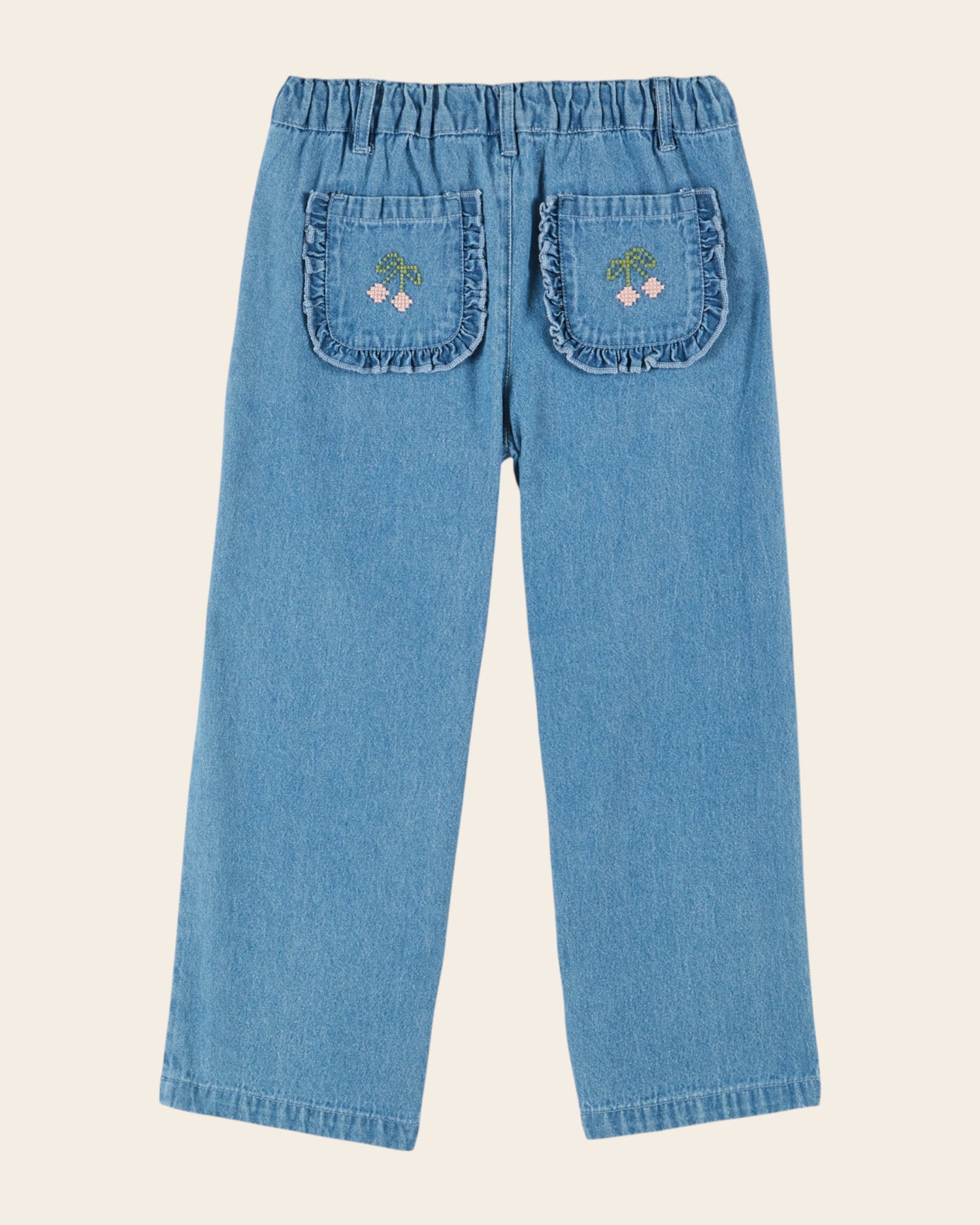 Blue denim cotton canvas pants. Mini embroidered cherries enliven the edge of the Italian pockets and cross-stitch cherries brighten up the patch and ruffled pockets on the back.