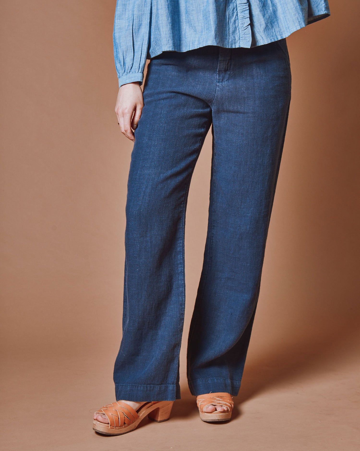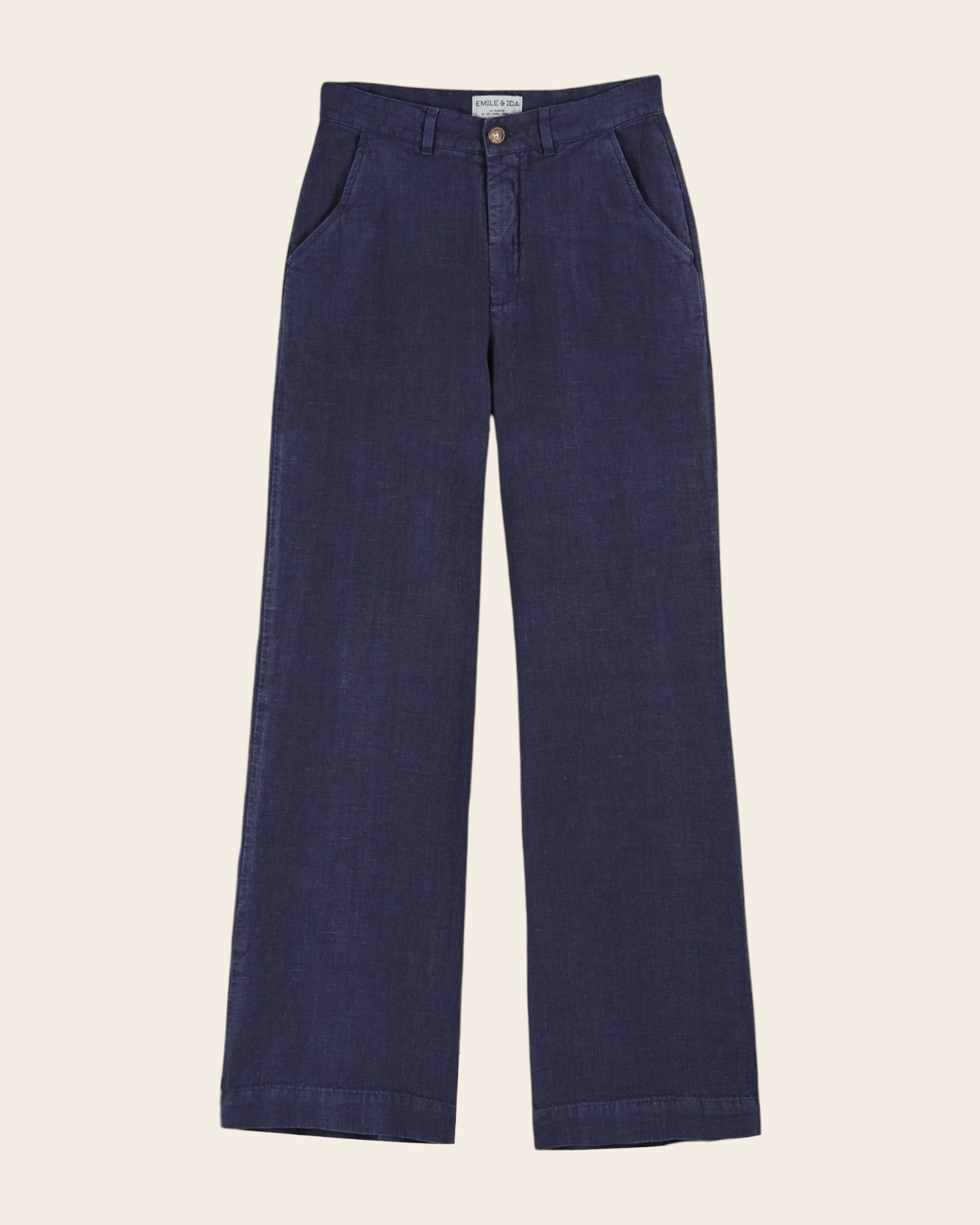 Wide straight-leg pants in navy linen.