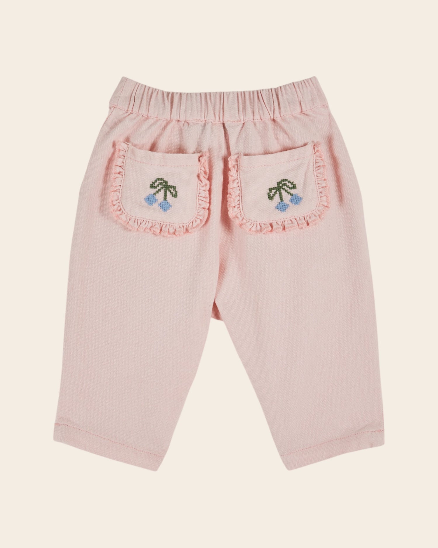 Pink cotton canvas pants. Mini embroidered cherries enliven the edge of the Italian pockets and cross-stitch cherries brighten up the patch and ruffled pockets on the back.