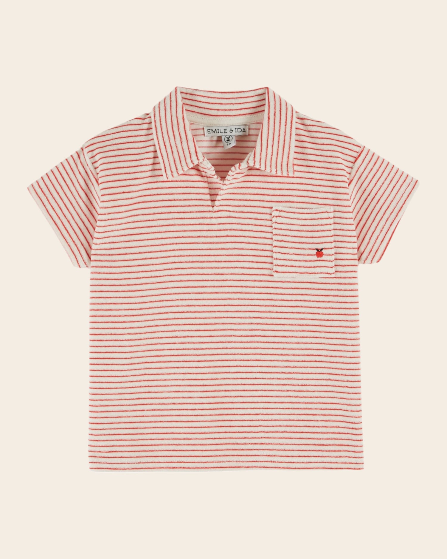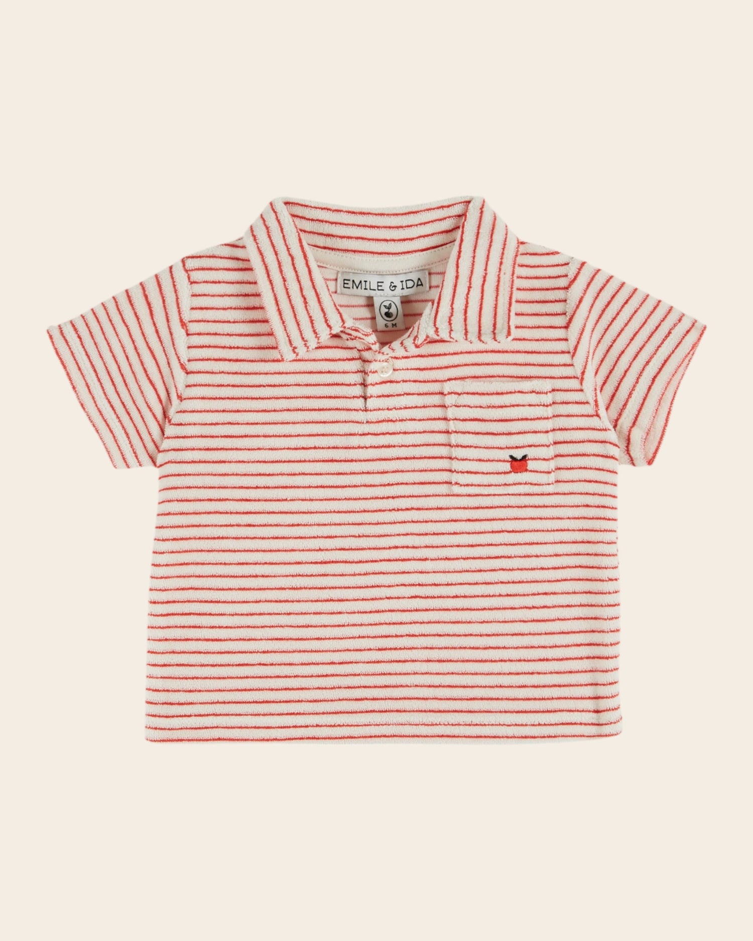 Polo shirt in organic cotton velvet and mixed fibers with fine red stripes on an ecru background.