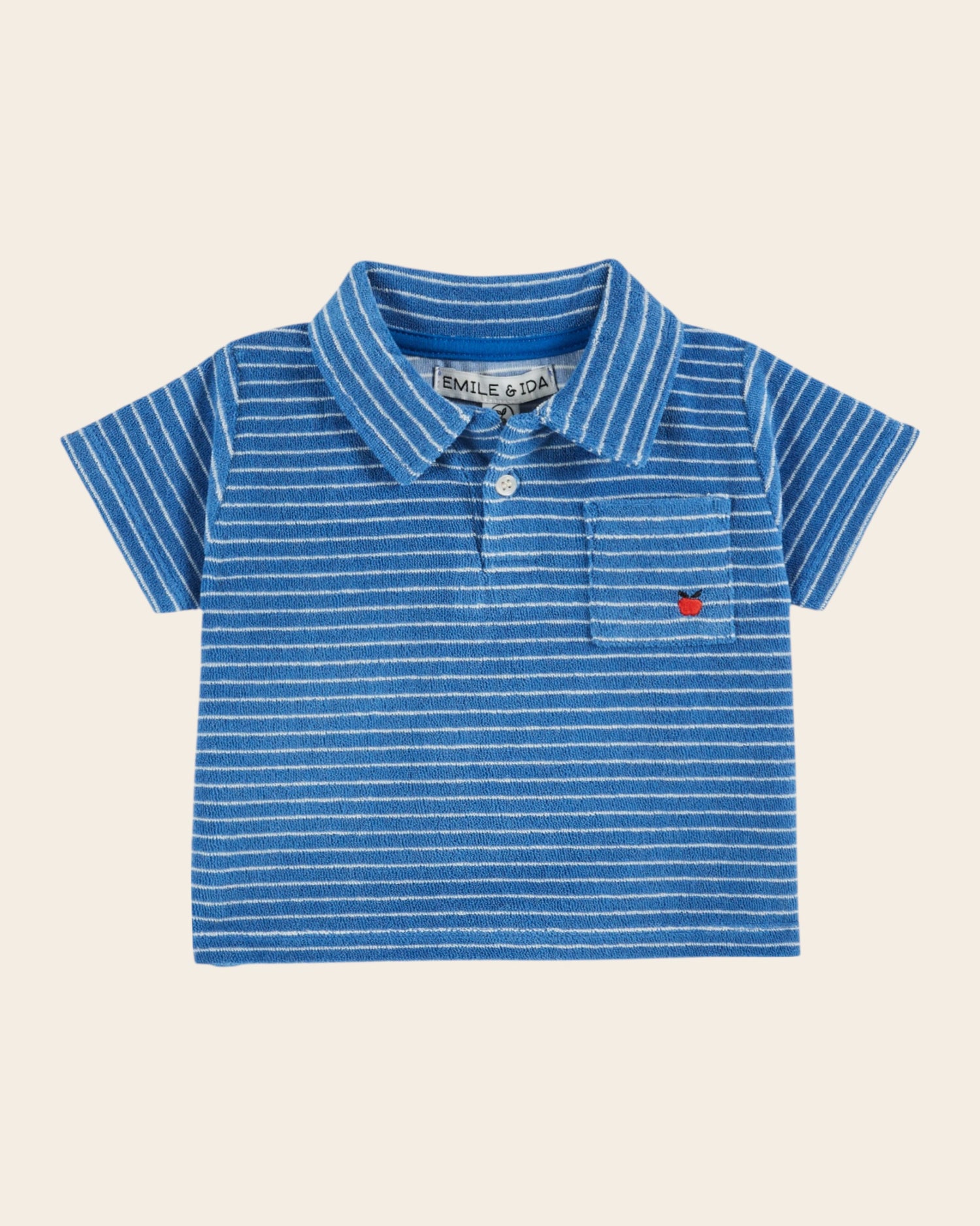 Polo shirt in organic cotton velvet and mixed fibers with very fine white stripes on a blue background.