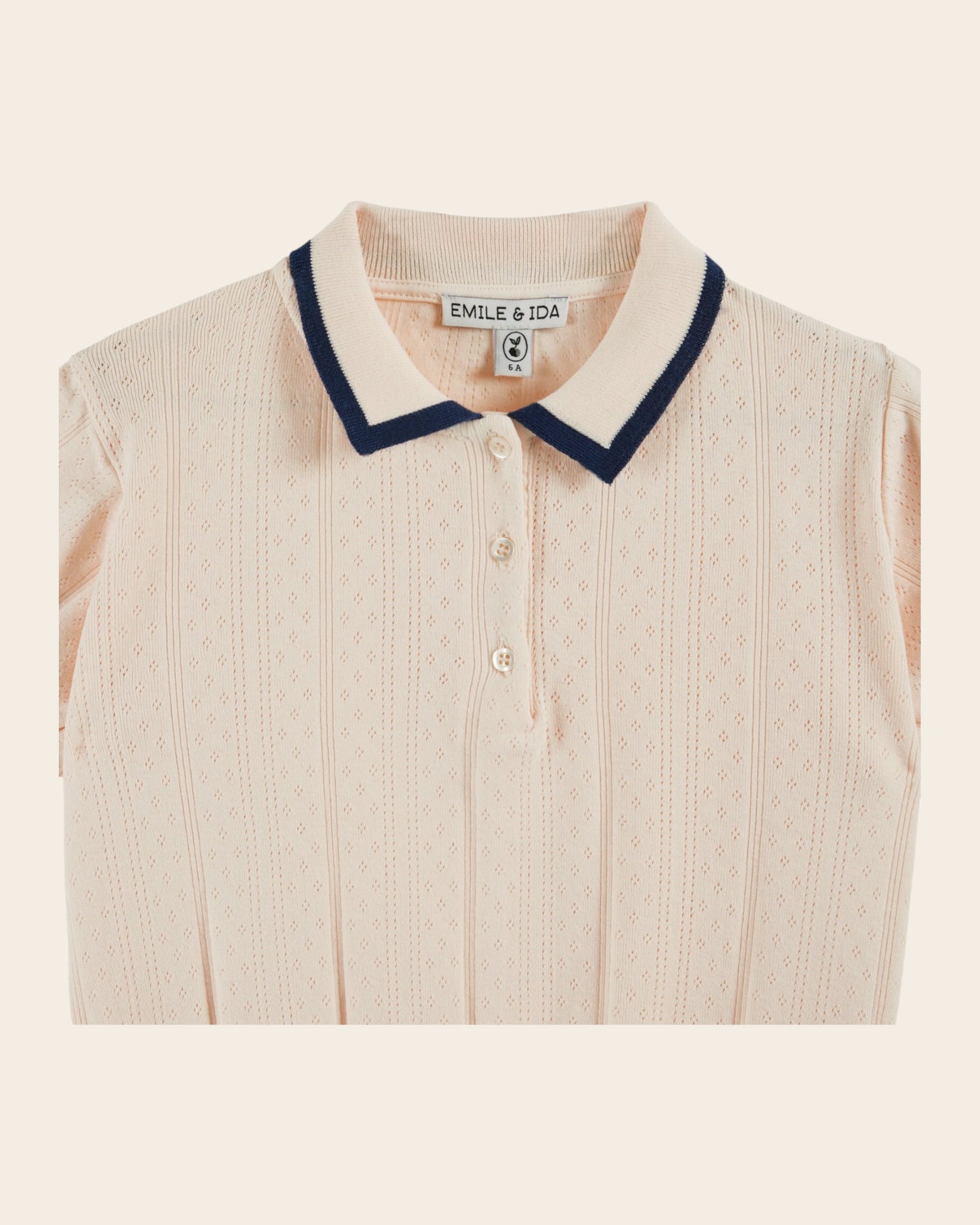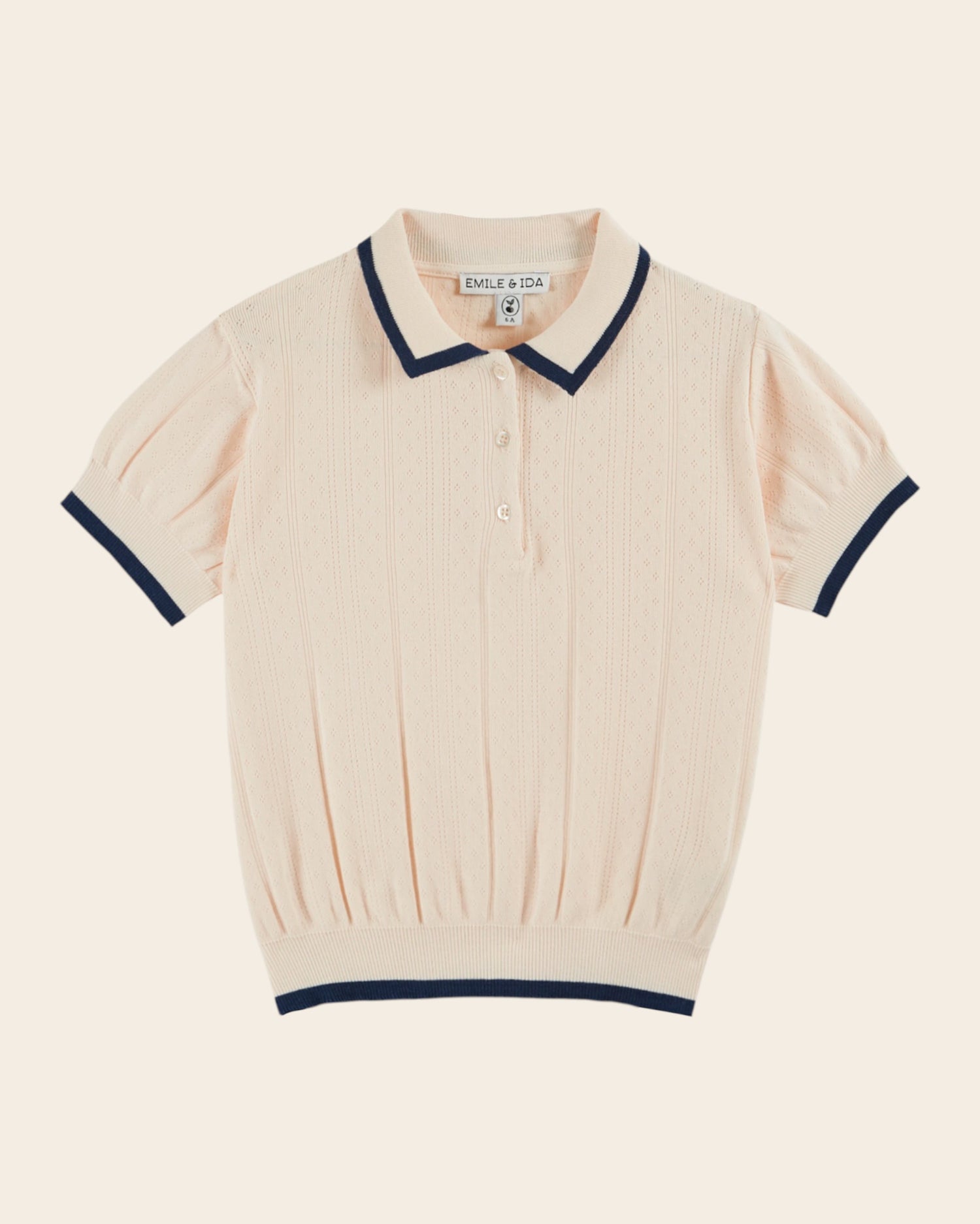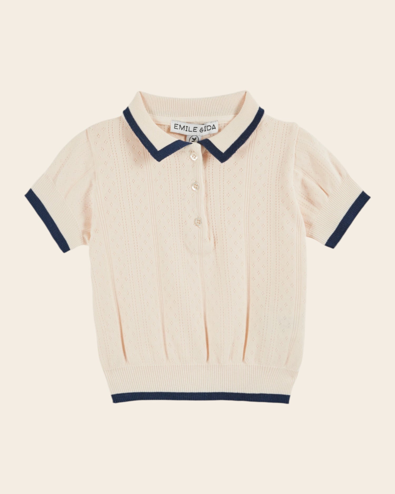 Polo shirt in cream cotton rib and modal. The repetition of openwork pointelle knit patterns energizes the solid color.