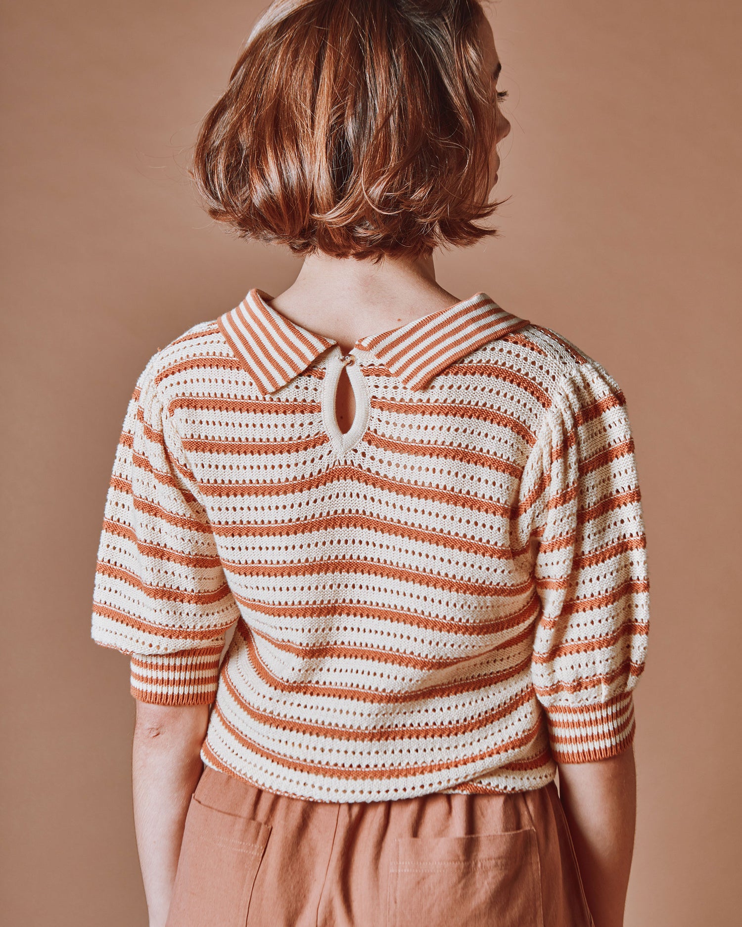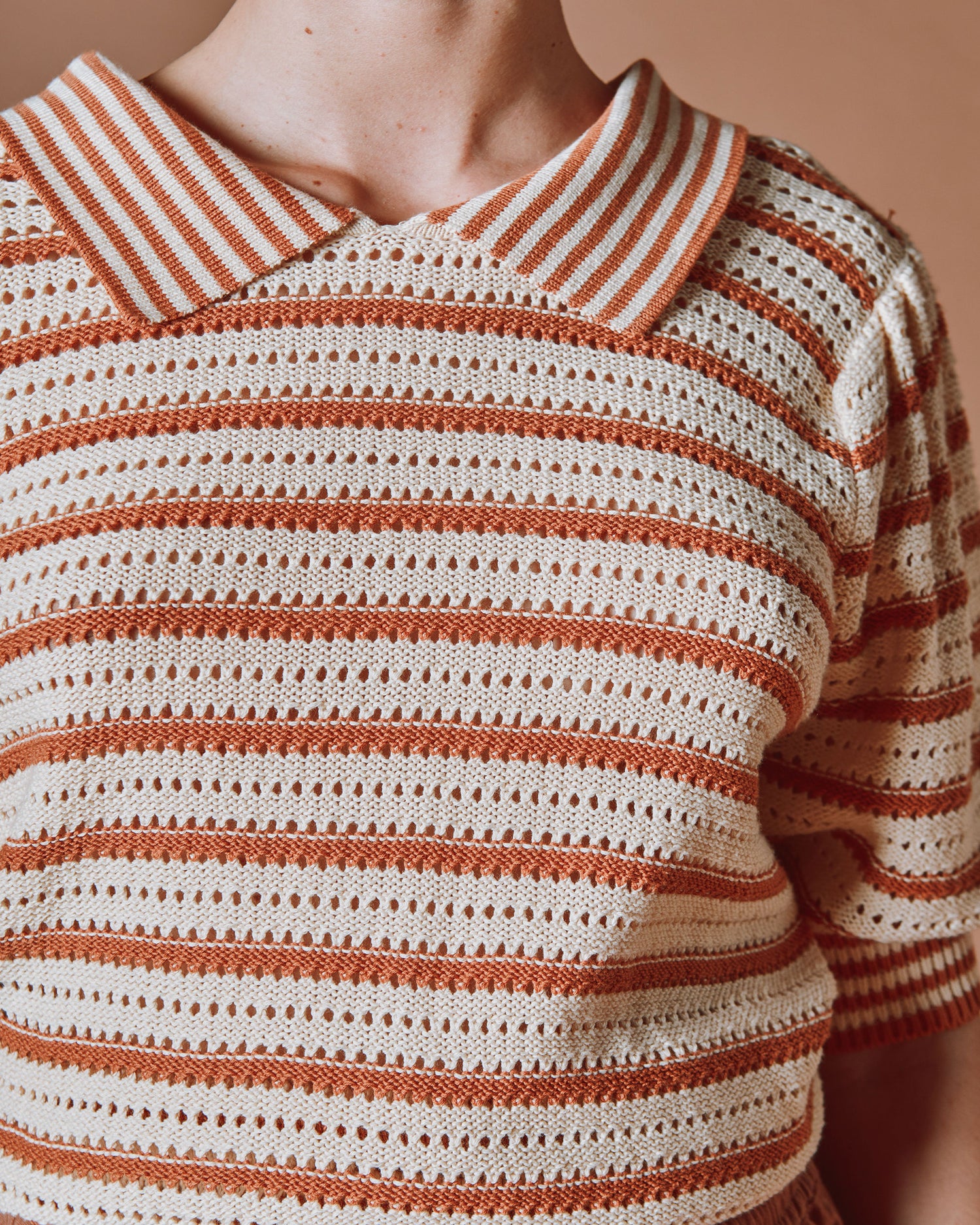 Crocheted organic cotton polo shirt with ecru and cinnamon brown stripes.