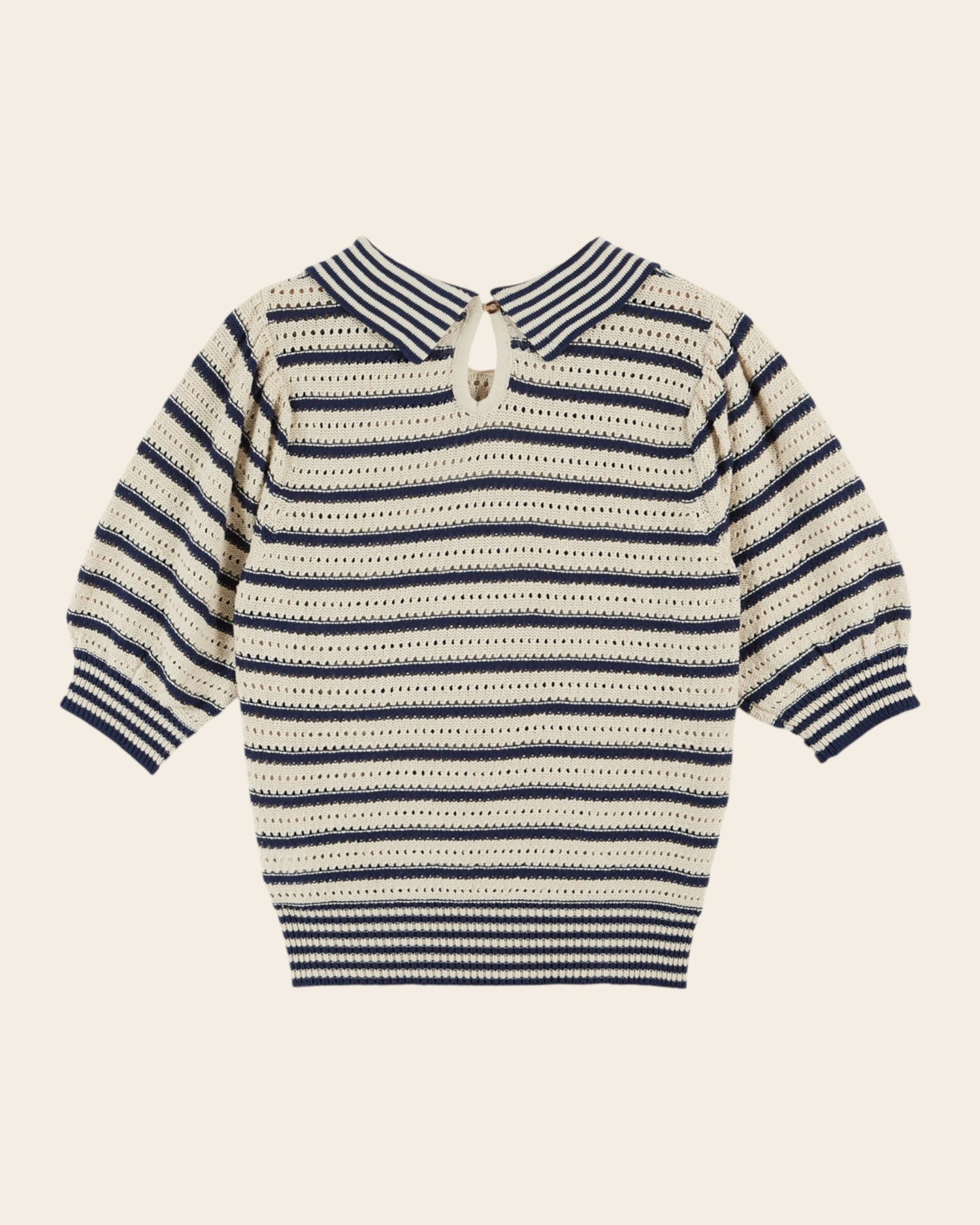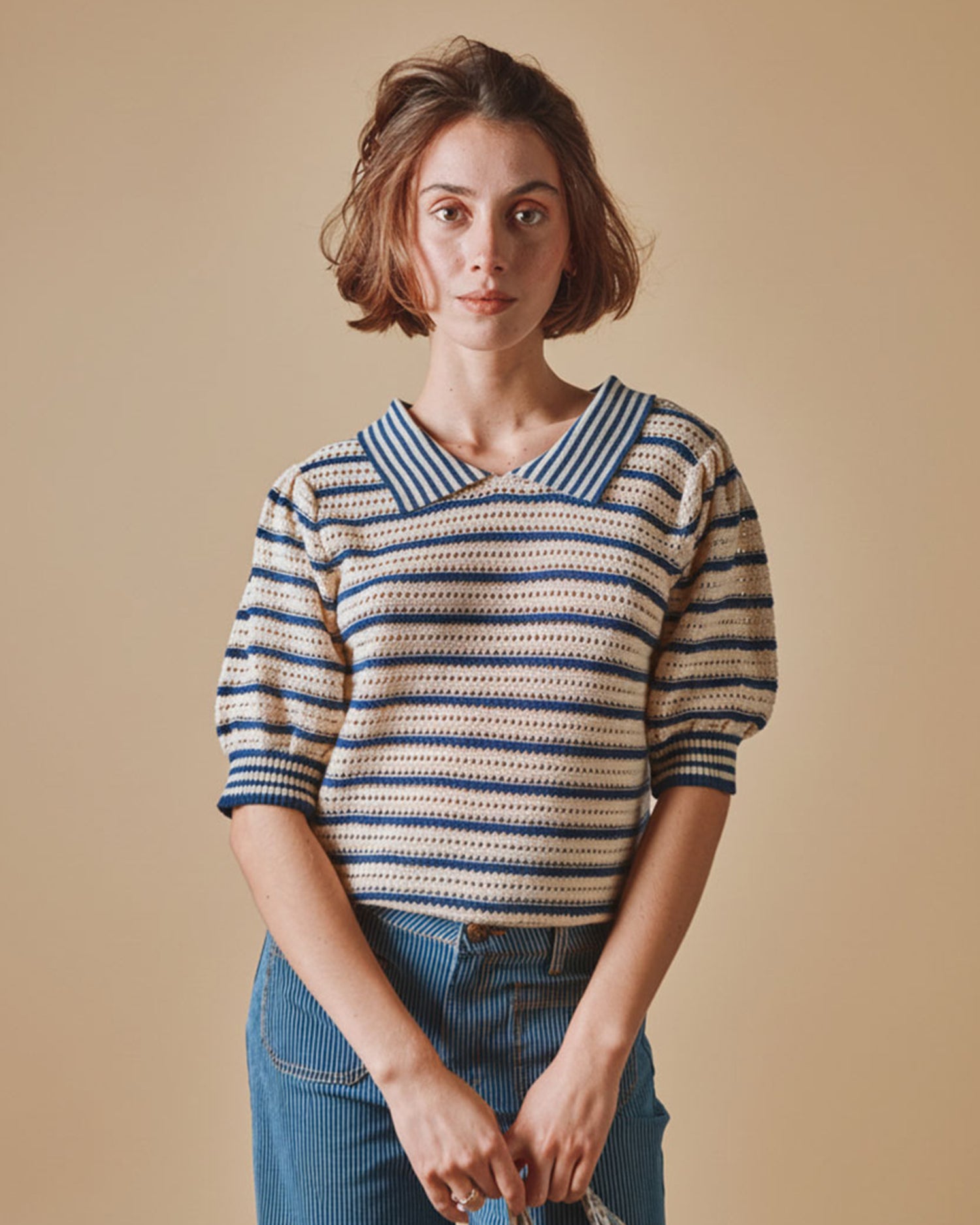 Crocheted organic cotton polo shirt with ecru and blue navy stripes.
