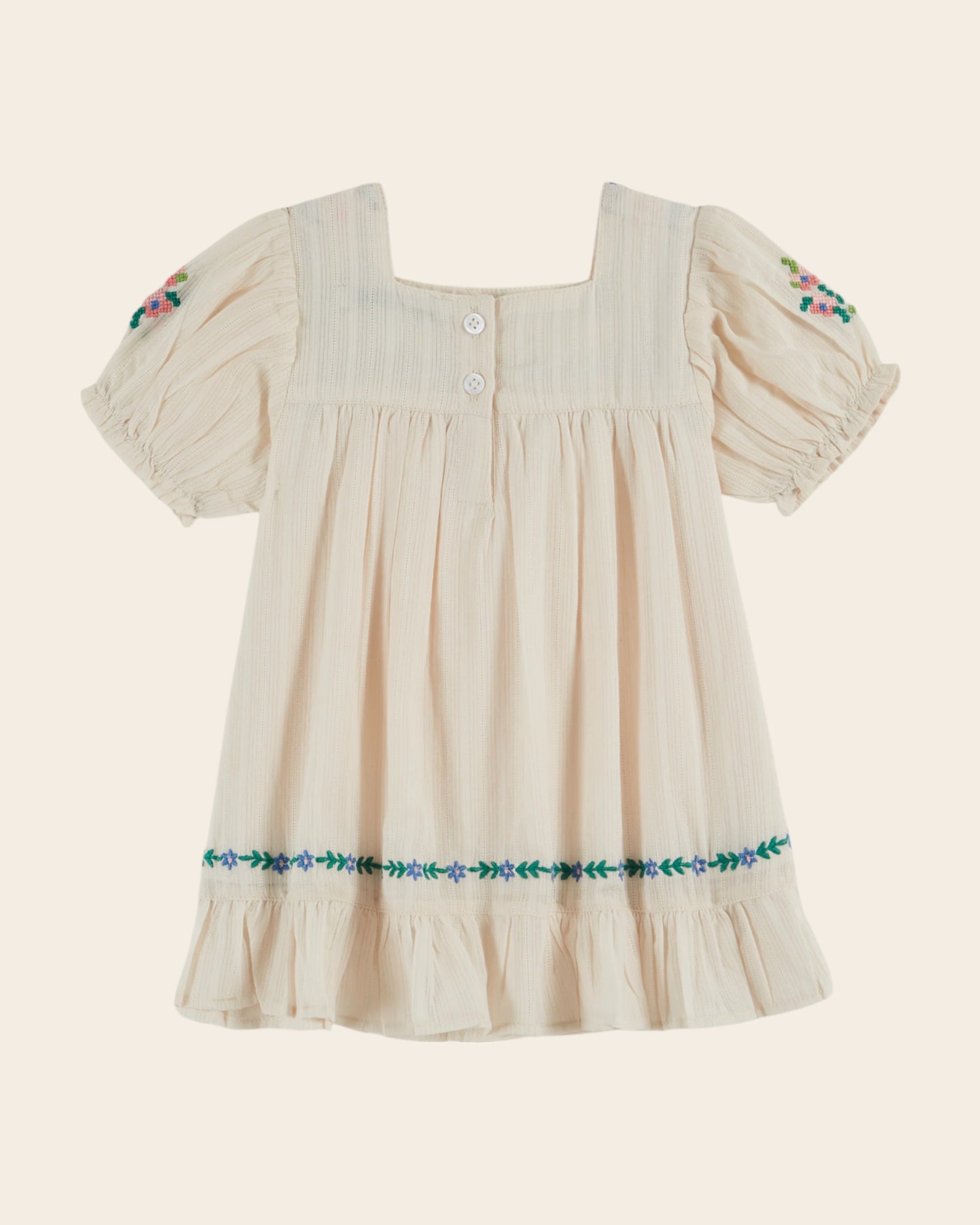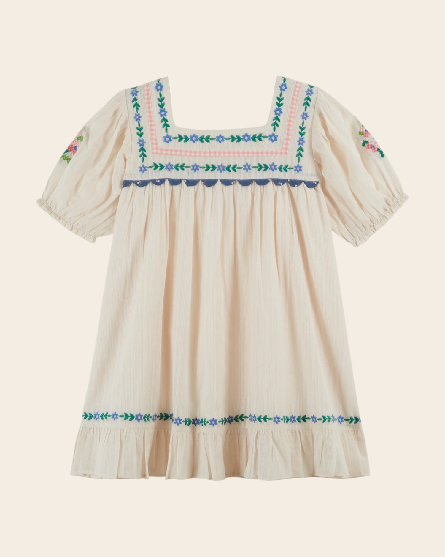 - Square neckline framed at the front by a line of embroidered flowers followed by a pink gingham braid then a new line of embroidered flowers