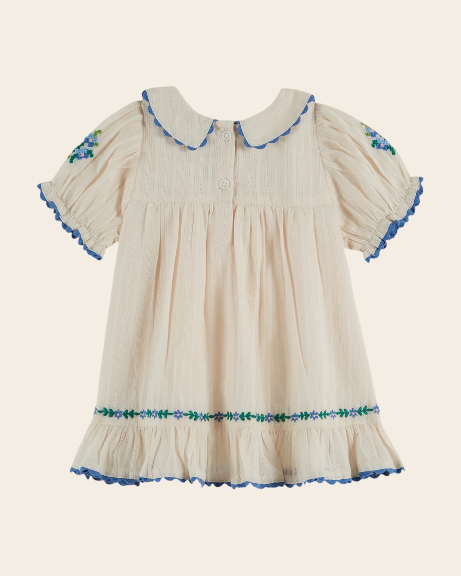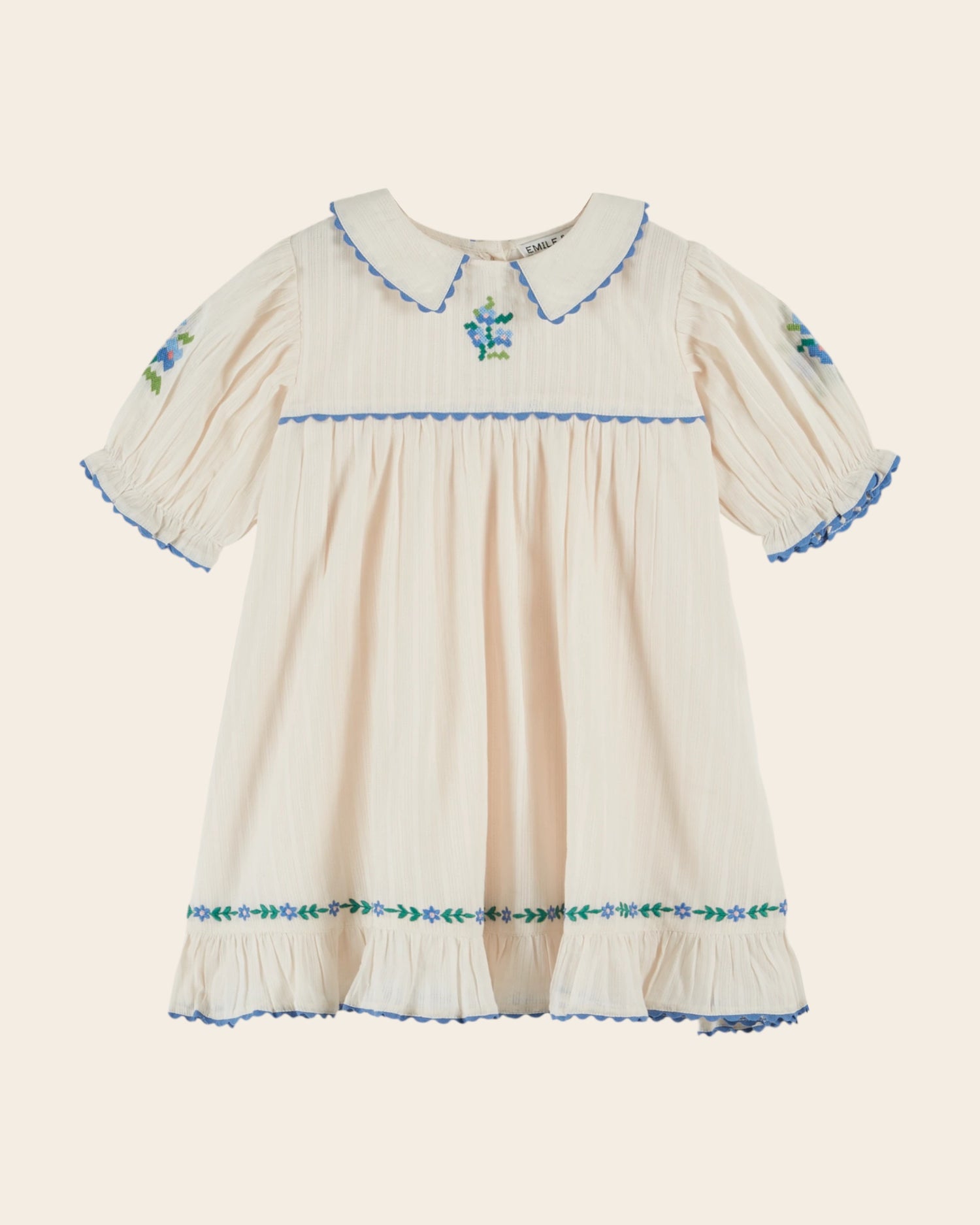 - Flowers embroidered in cross stitch on the yoke and on the sleeves