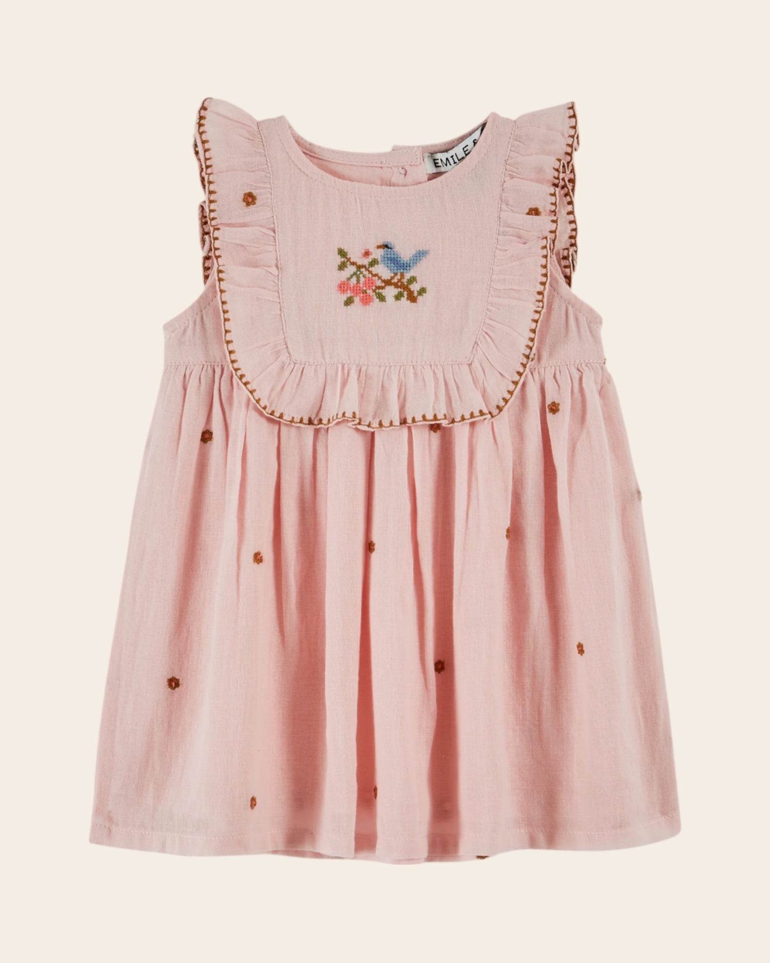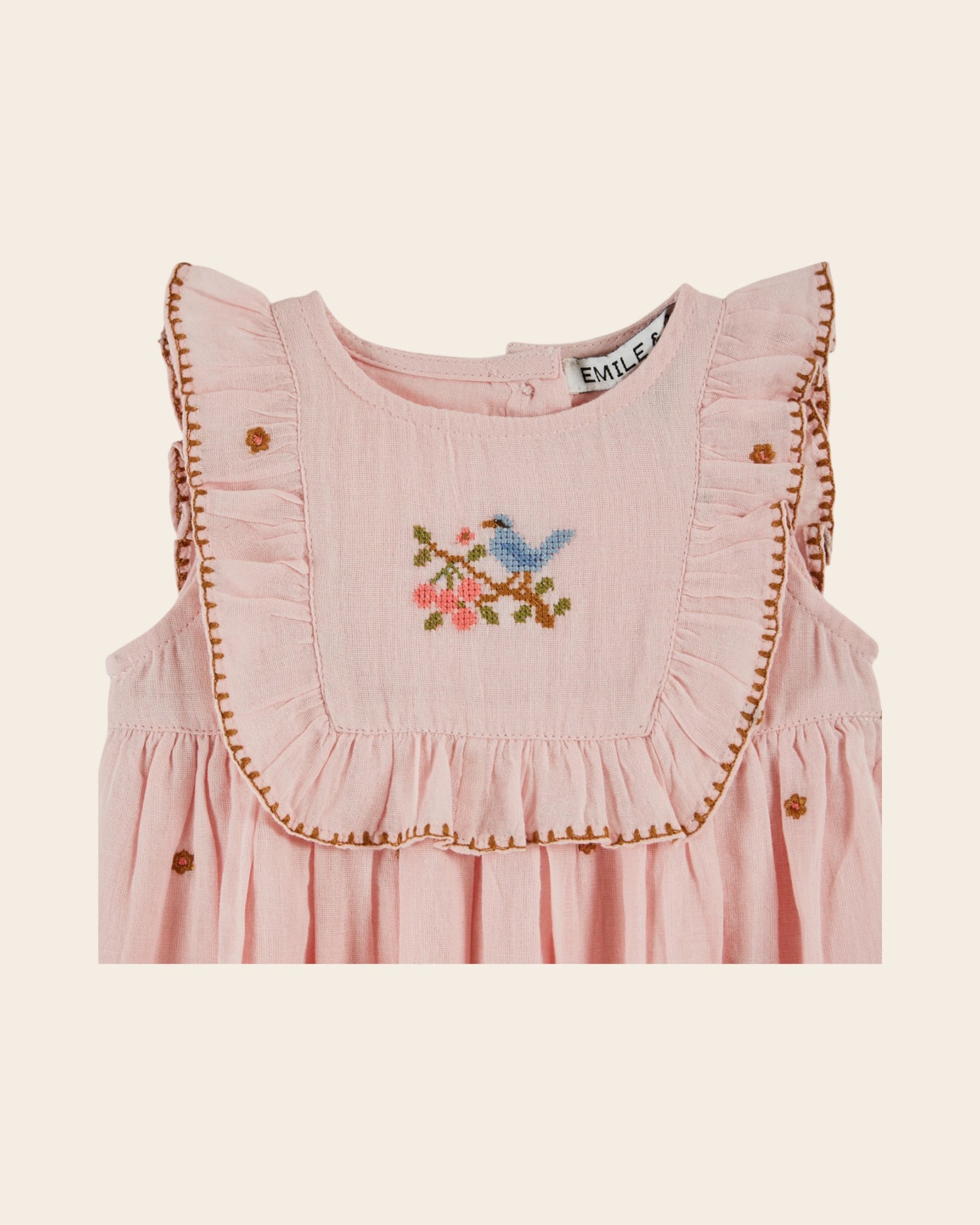 Sleeveless baby dress in pink organic cotton gauze. It is fully lined to counter the fineness of the fabric.