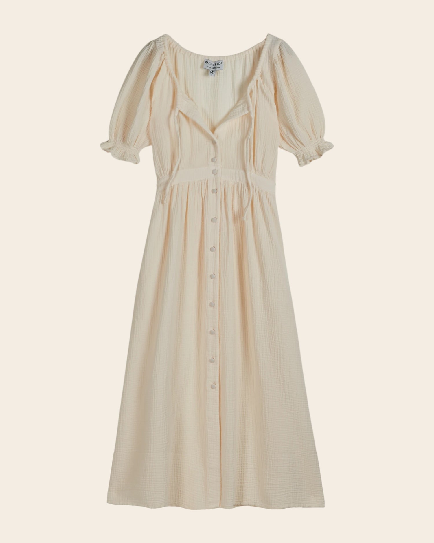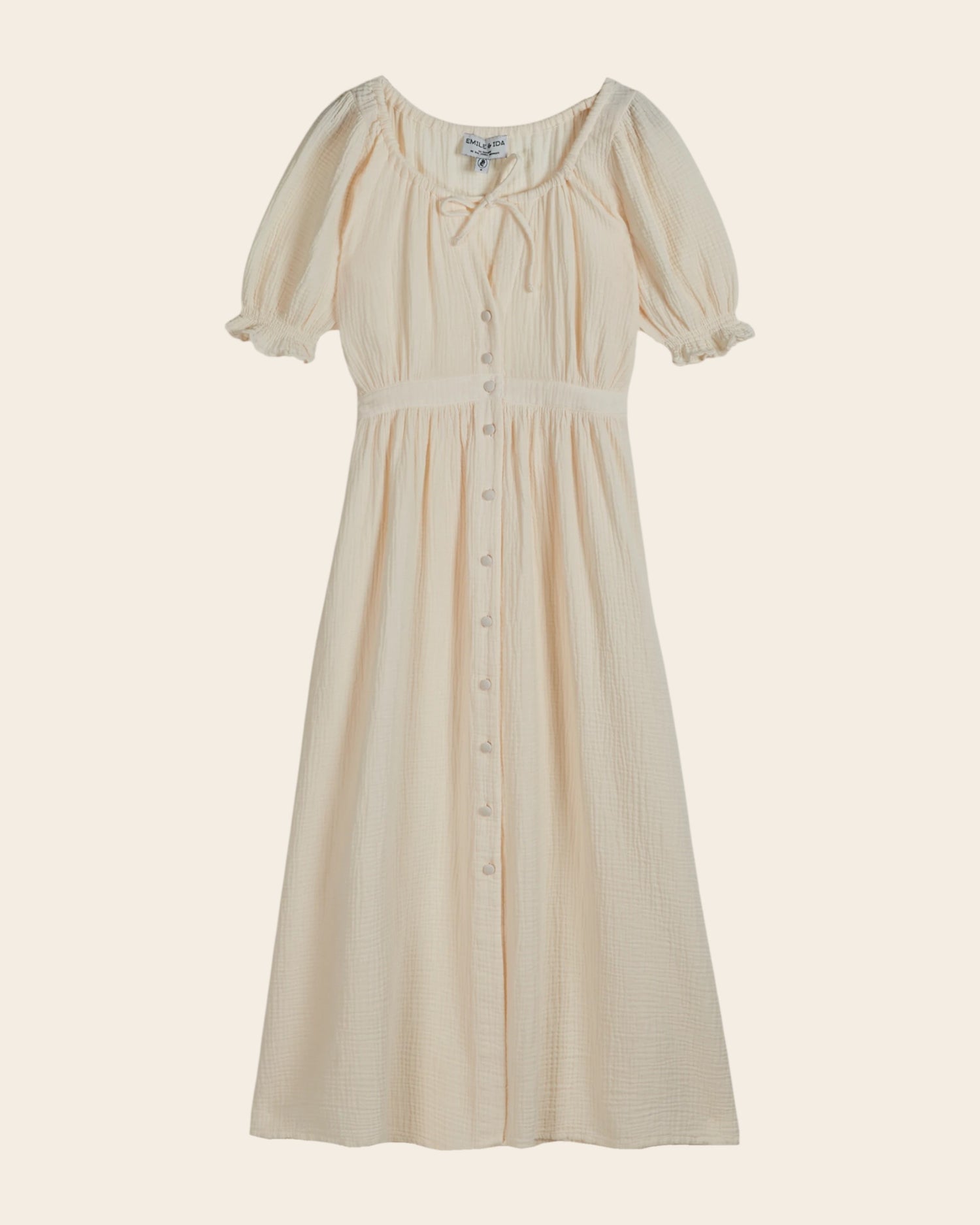 Long cream cotton gauze dress. Its textured fabric, round neckline, and defined waist make this a decidedly feminine dress.
