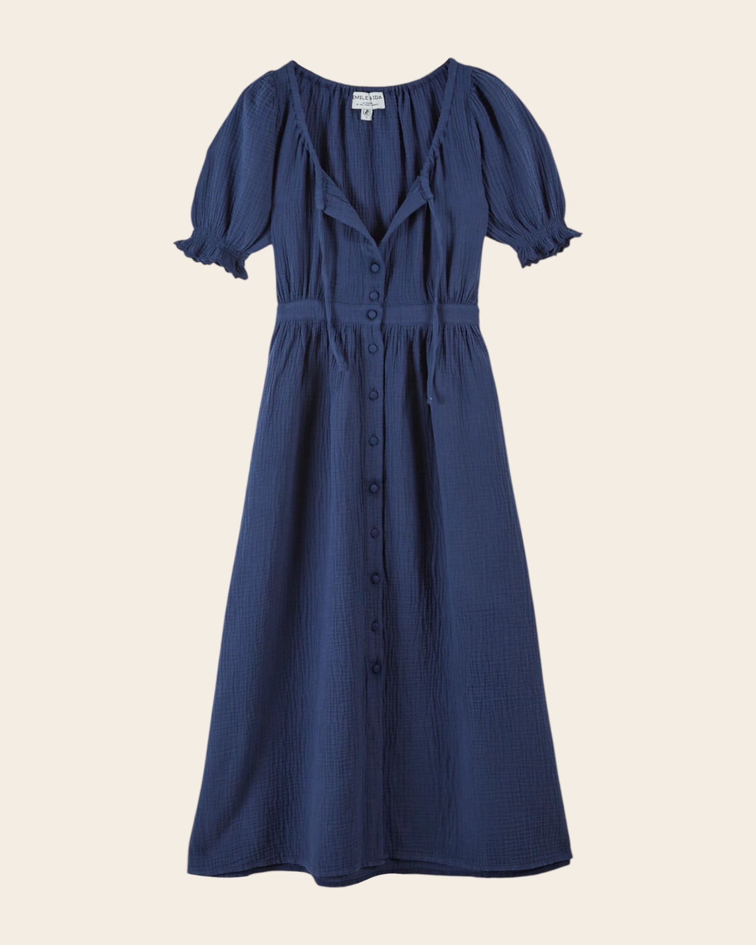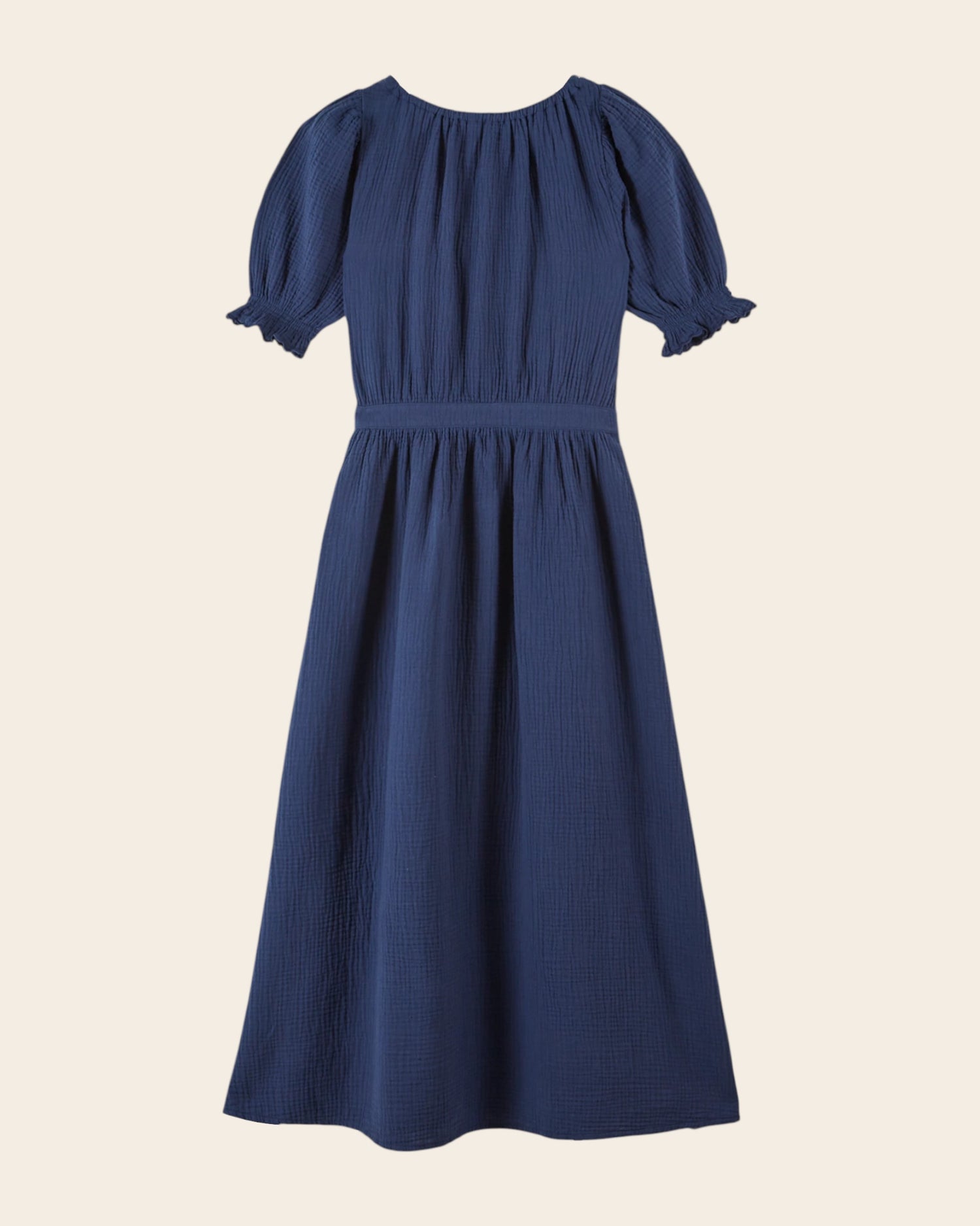 Long navy cotton gauze dress. Its textured fabric, round neckline, and defined waist make this a decidedly feminine dress.