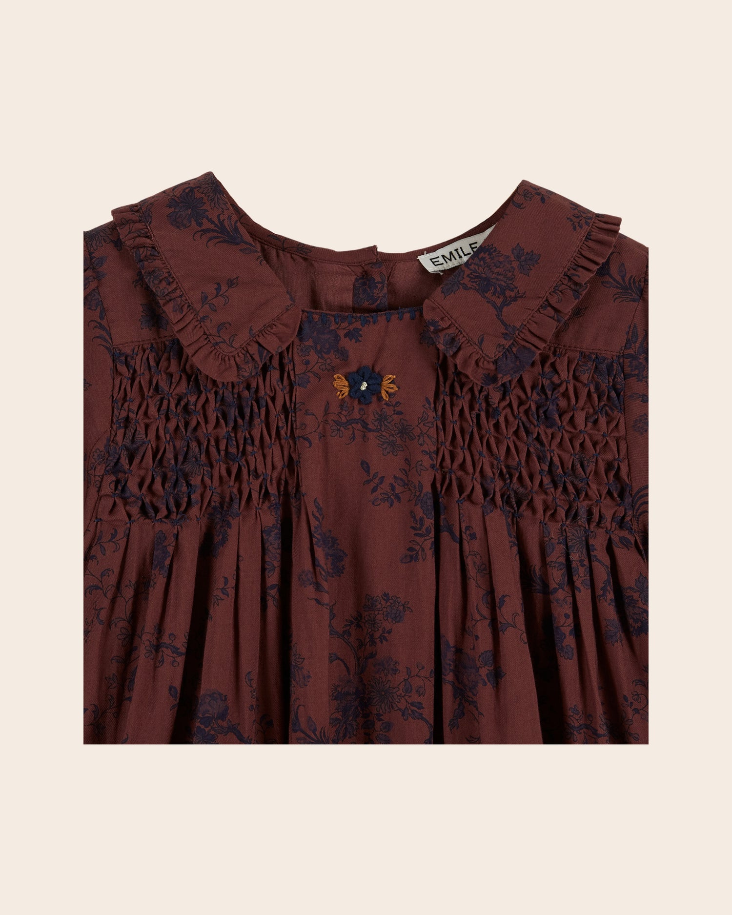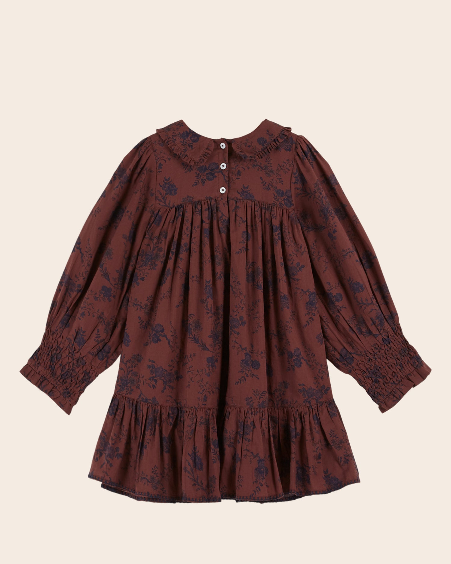 Smocked, ruffled cotton flannel dress adorned with blue flowers on a purple background.