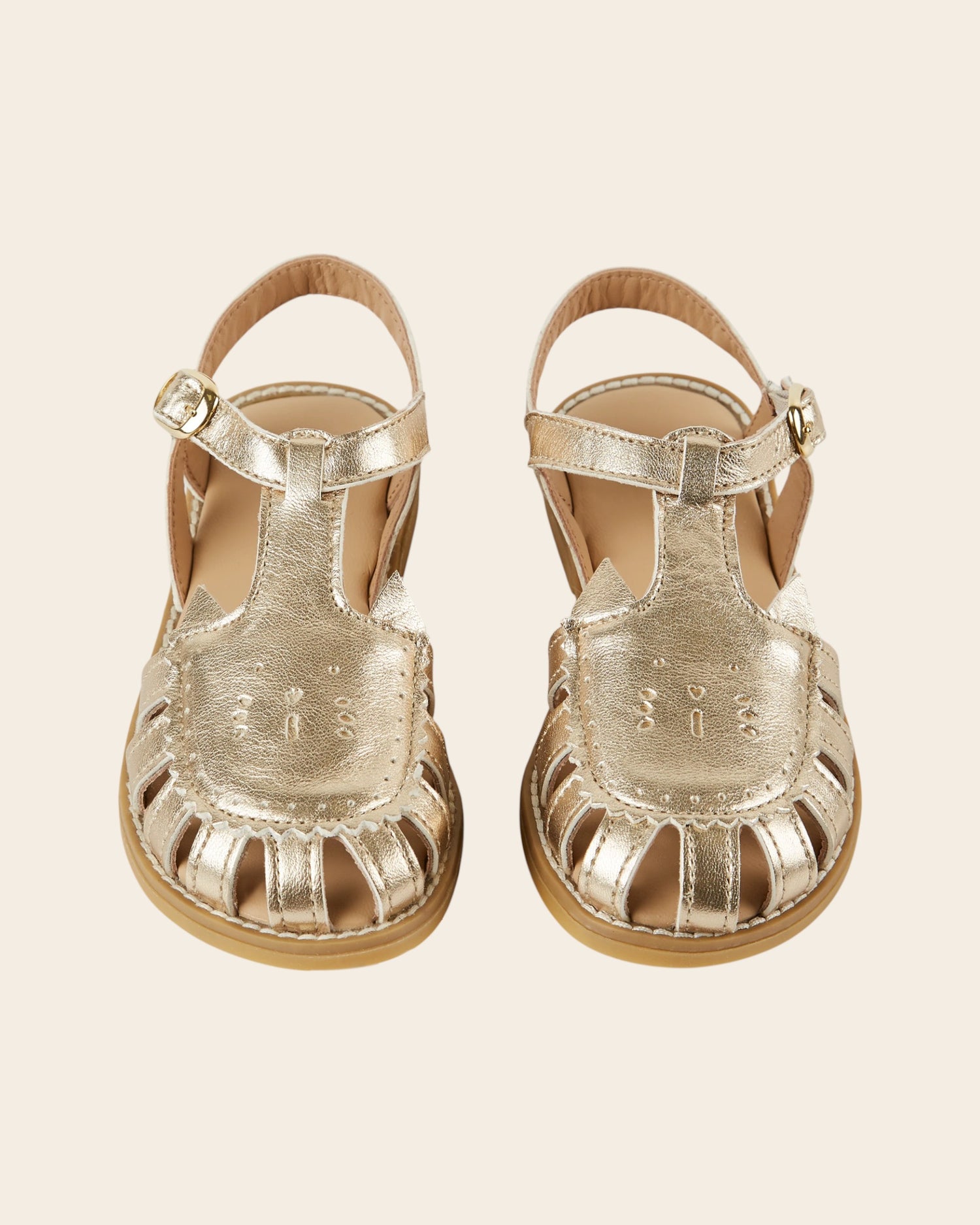 Golden sandals, decorated with perforations on the top of the foot depicting the eyes, whiskers and nose of a kitten.