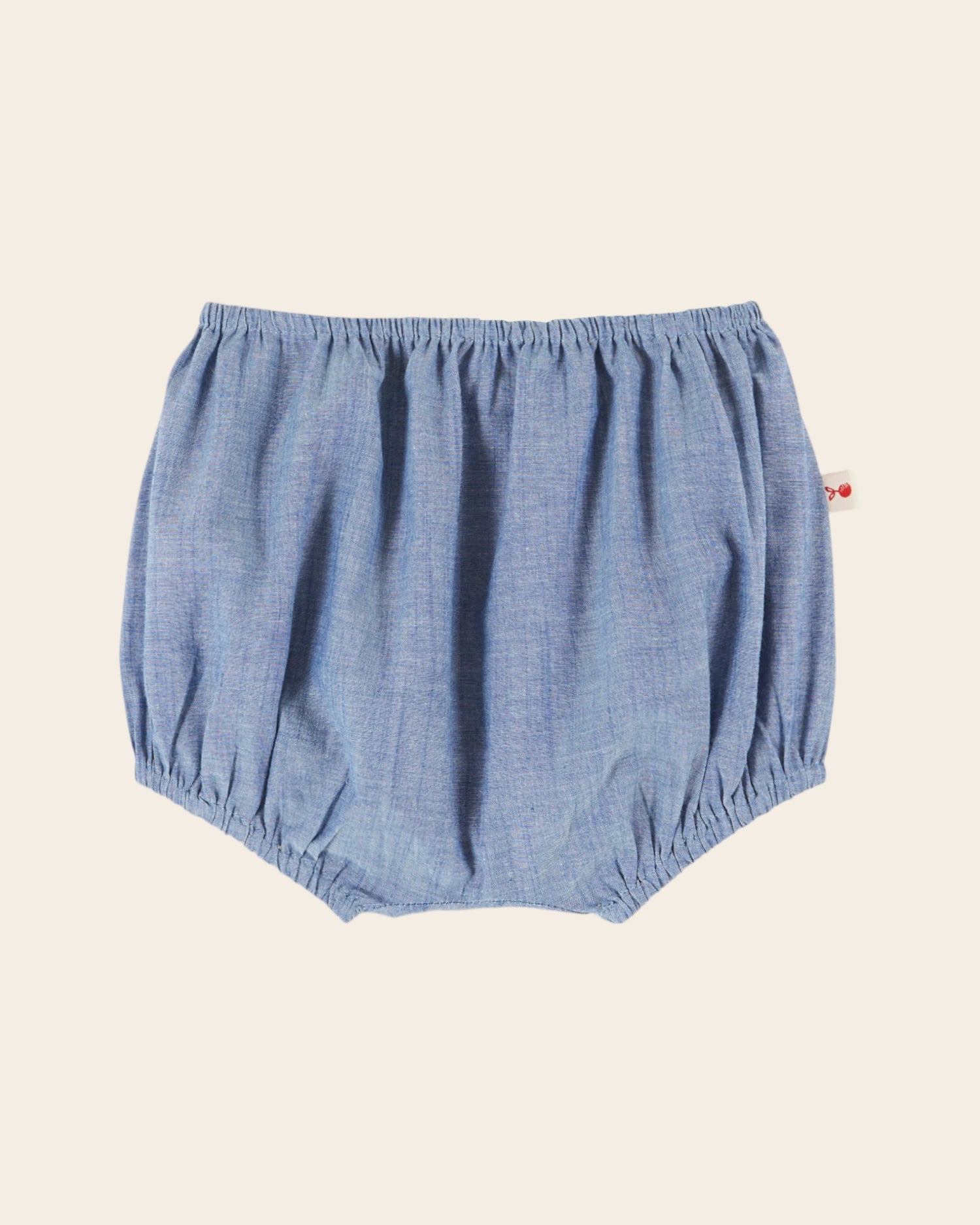 Bloomers in heather blue chambray cotton. Worn with a t-shirt, it is suitable for baby boys or girls, worn under a dress, it completes the look for baby girls.