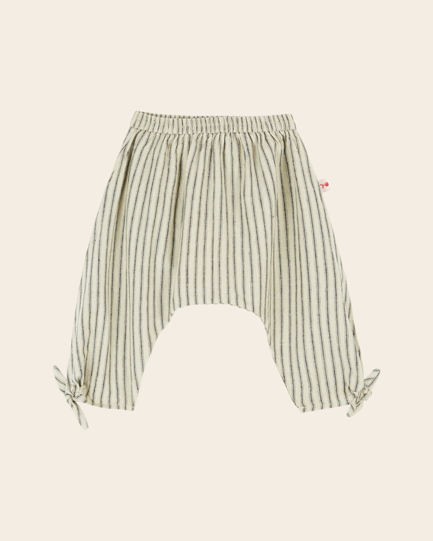 Baby harem pants in gray cotton canvas with bitumen stripes. The material has some irregularities in the weaving and this contributes to the specificity of the pants.
