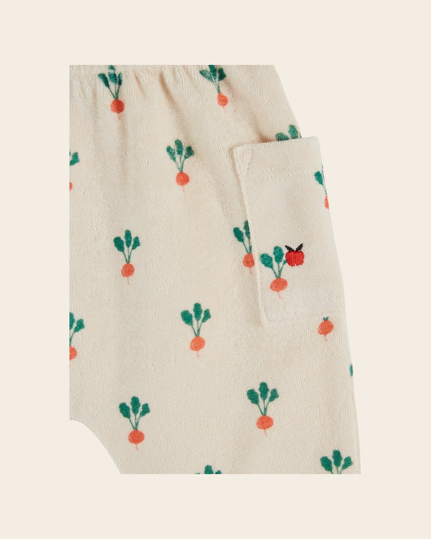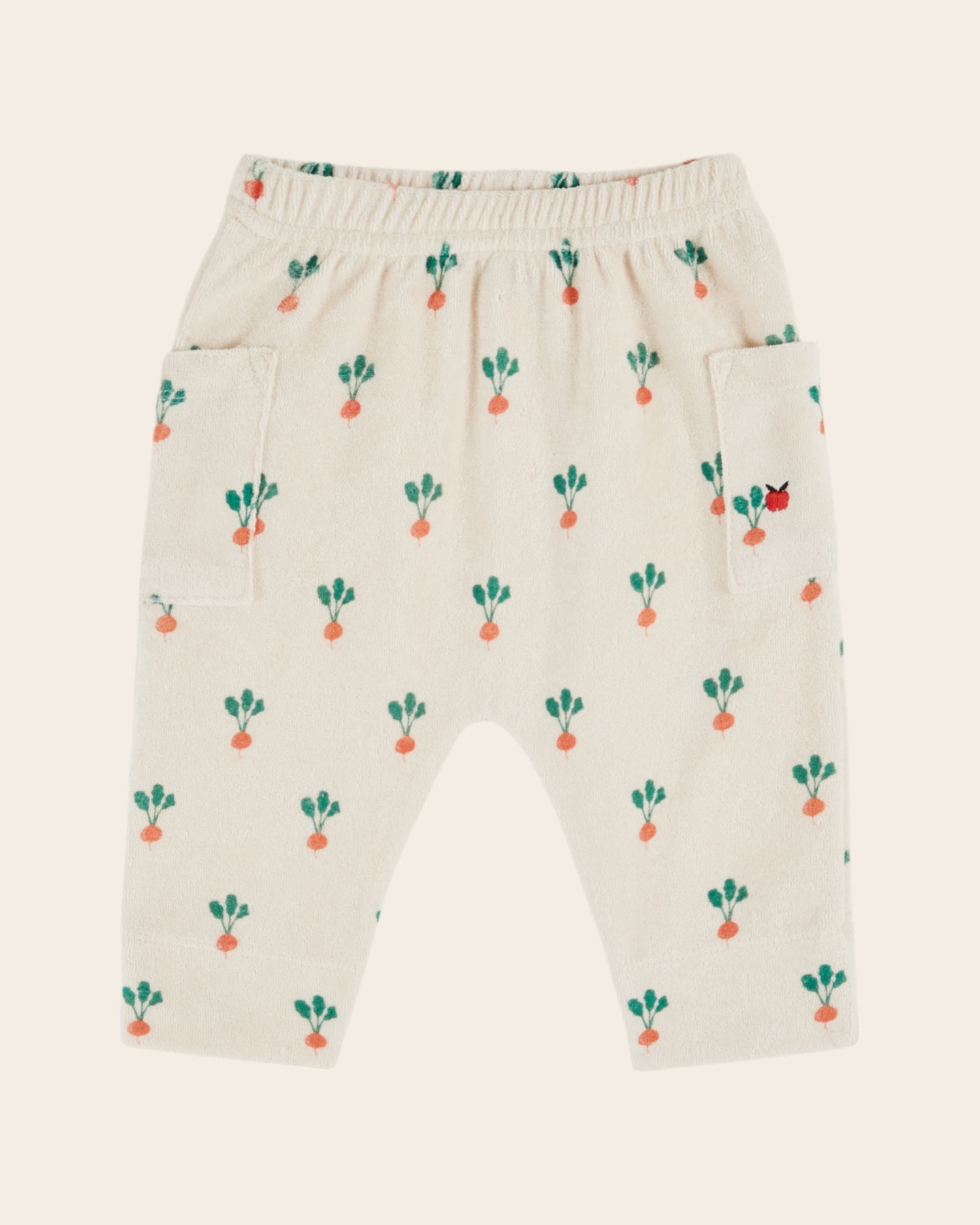 Harem pants in organic cotton velvet and cream mixed fibers printed all-over with red radishes.