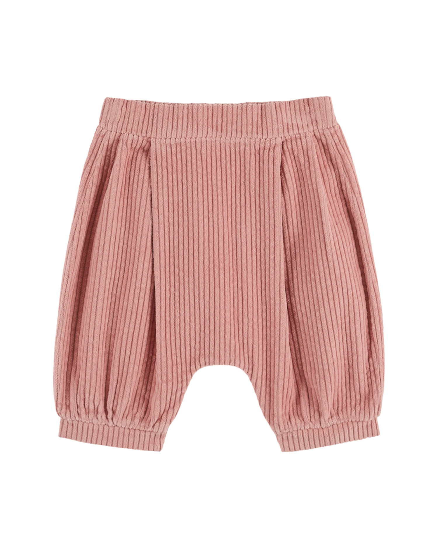 Pink cotton corduroy pants. The sarouel shape and thick, soft ribbed velvet make these pants very comfortable, as we've heard from the babies who've tried them. In the back, to adjust to all waist sizes, a buttoned elastic is slipped into the waistband and a pocket enlivens the buttocks. On the front, folds provide sufficient volume for all little tummies. The lower legs are tightened at the ankles to prevent the wind from blowing in and chilling your babies.
