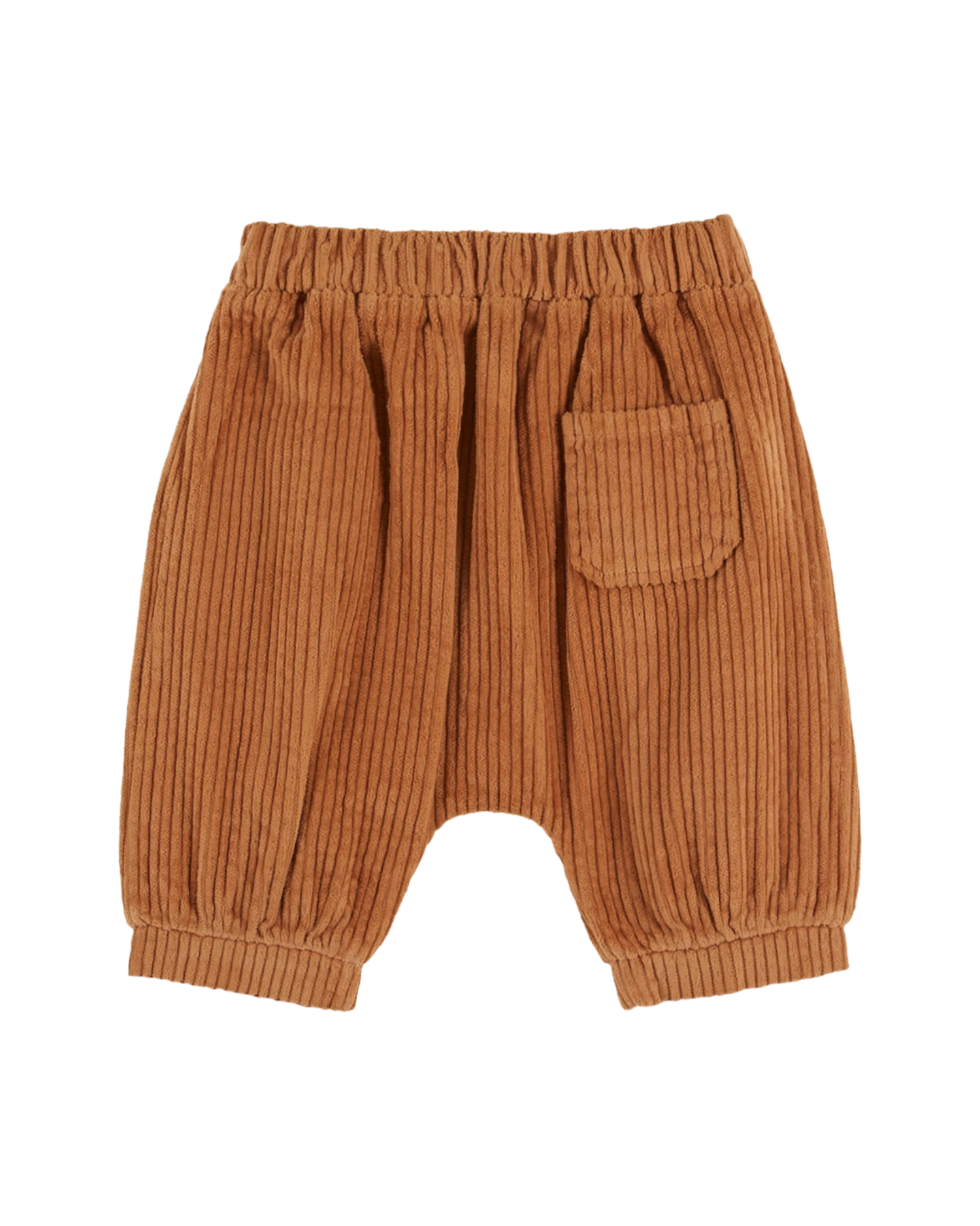 Golden crescent cotton corduroy pants. The sarouel shape and thick, soft ribbed corduroy make these pants very comfortable, as we've heard from the babies who've tried them. In the back, to adjust to all waist sizes, a buttoned elastic is slipped into the waistband and a pocket enlivens the buttocks. On the front, folds provide sufficient volume for all little tummies. The lower legs are tightened at the ankles to prevent the wind from blowing in and chilling your babies.