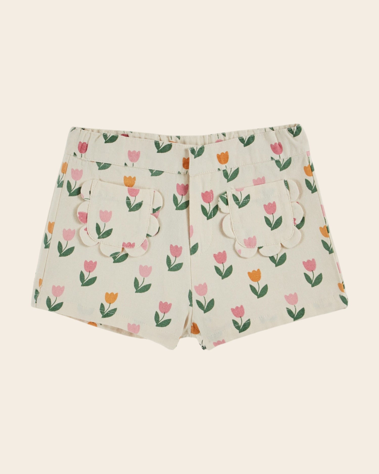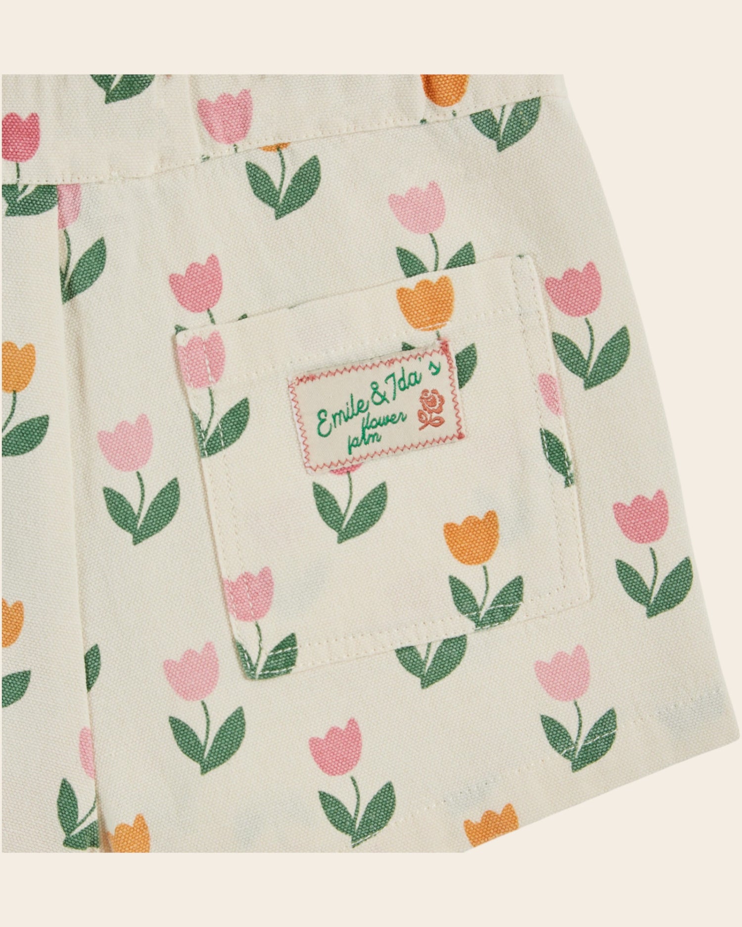 Shorts in cream cotton canvas printed all-over with pink and orange tulips.