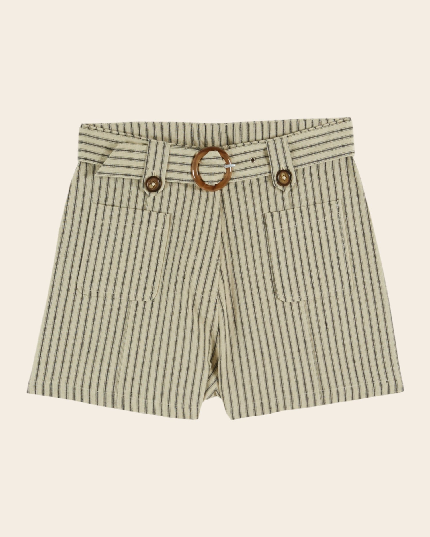 Dark ecru and black striped cotton shorts. The blend of materials creates a slightly textured feel, similar to linen.