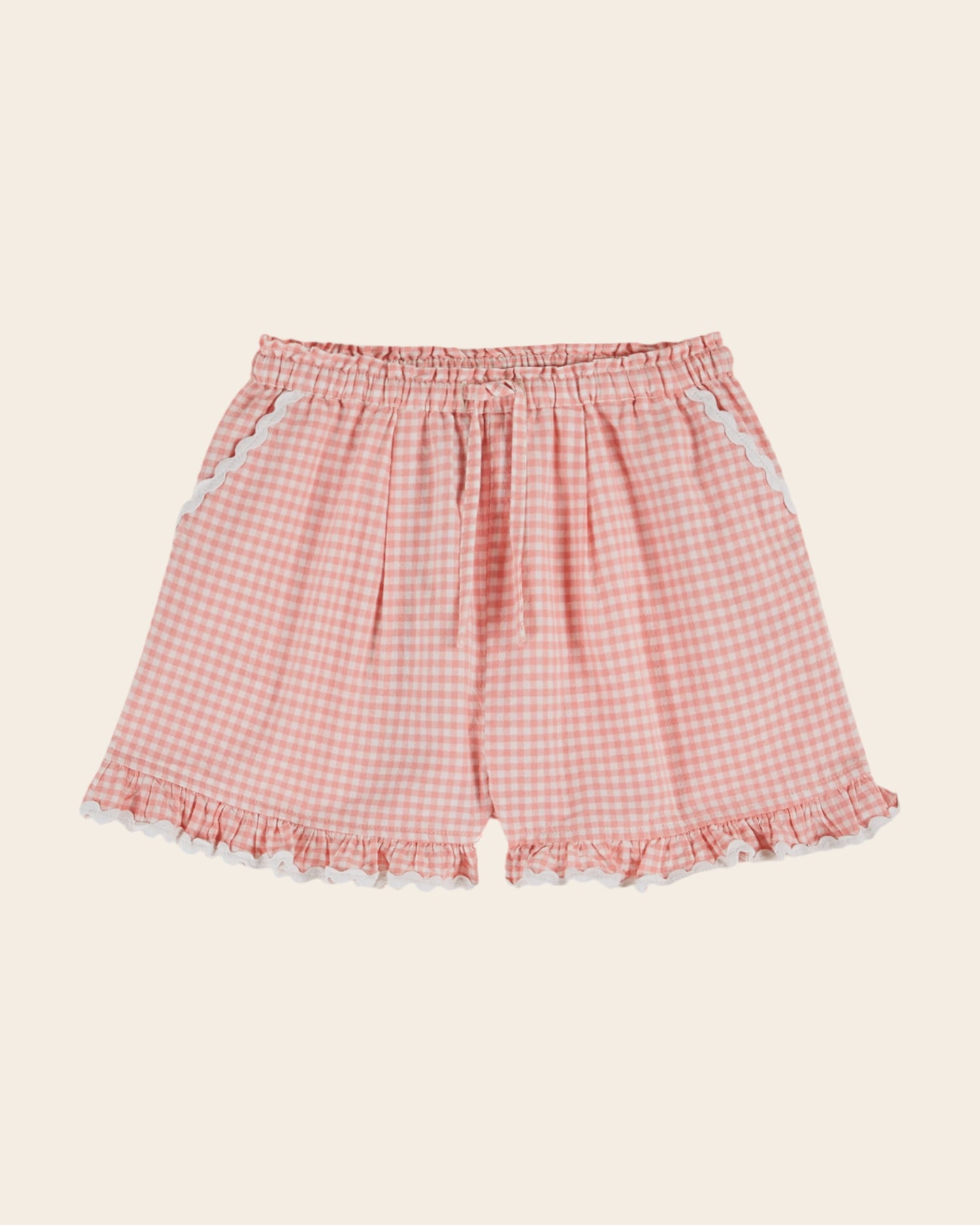 Shorts in organic cotton gingham with small pink and ecru checks for spending holidays in Saint-Tropez or elsewhere.