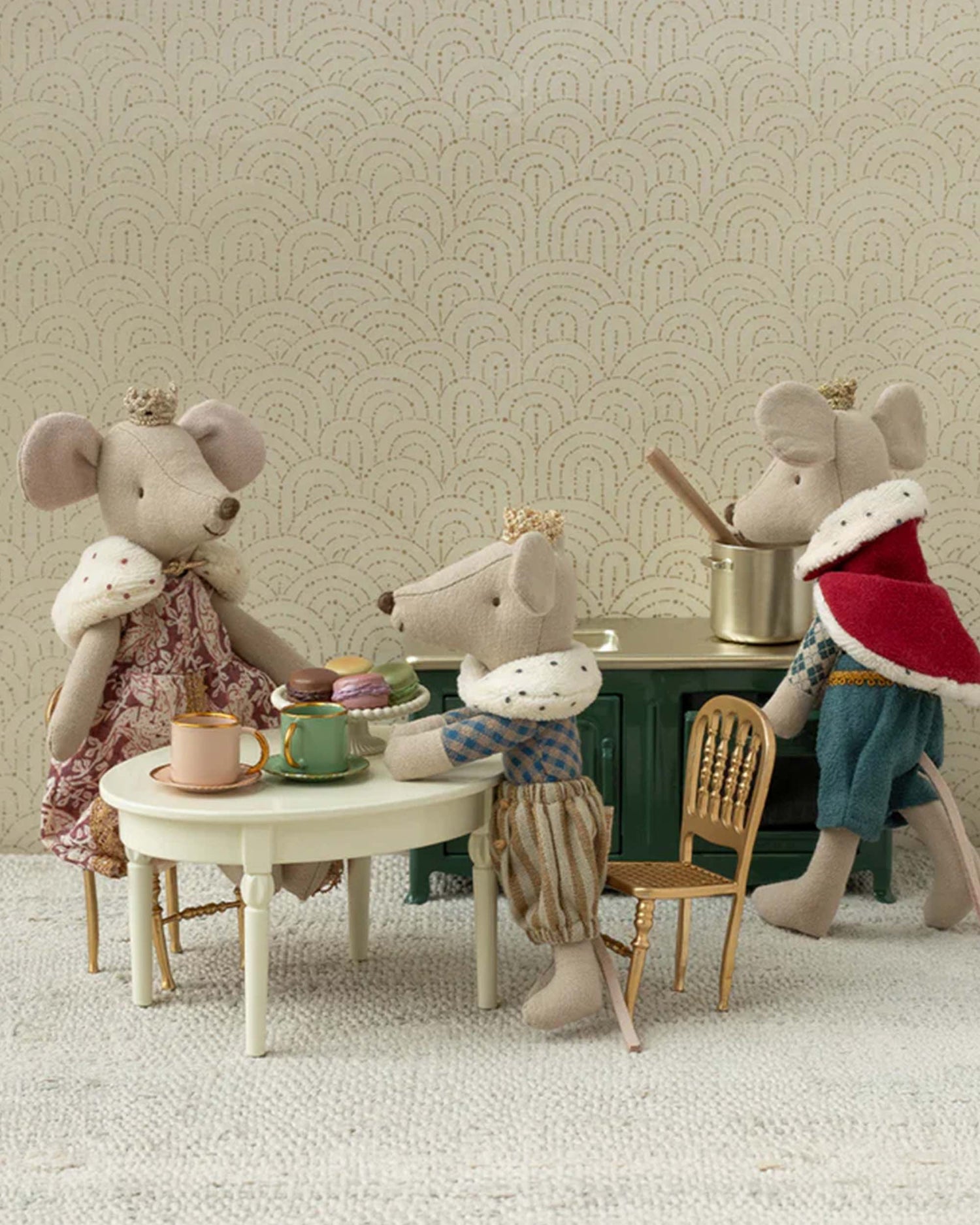 The Queen mouse in size Mum is ready to be a hostess in her Castle. She wears a beautiful royal dress and crown, and fits perfectly into the Castle Hall.