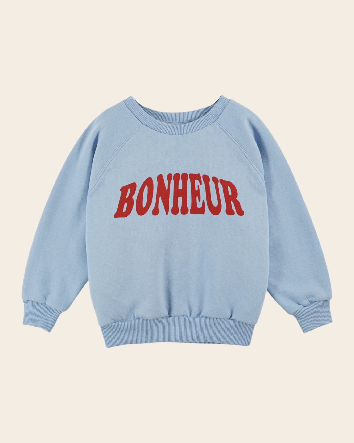 Sweatshirt in sky blue fleece organic cotton jersey which displays in red and large on the chest: BONHEUR (Hapiness). Something to put late risers in a good mood.