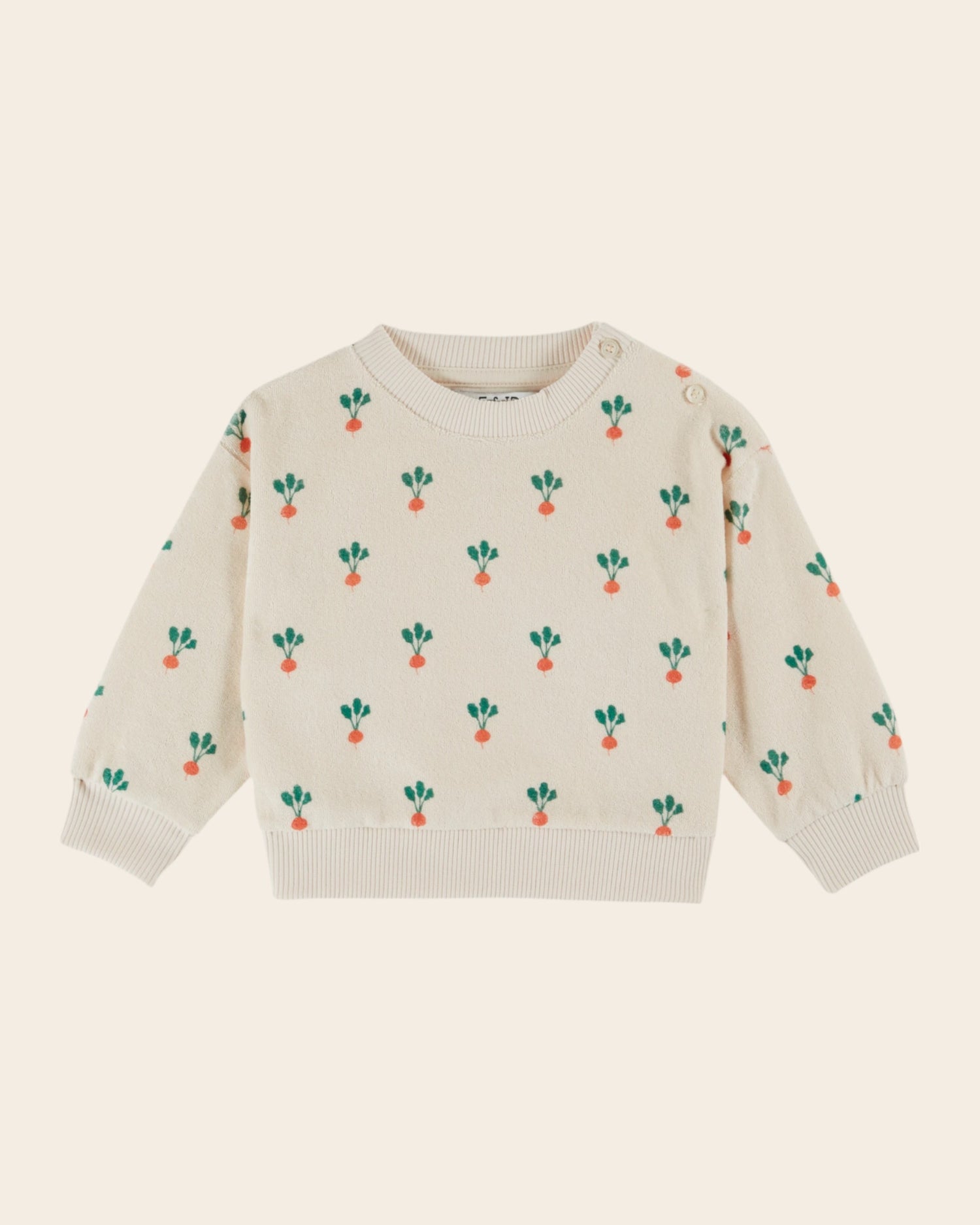 Sweatshirt in organic cotton velvet and cream mixed fibers printed all-over with red radishes.